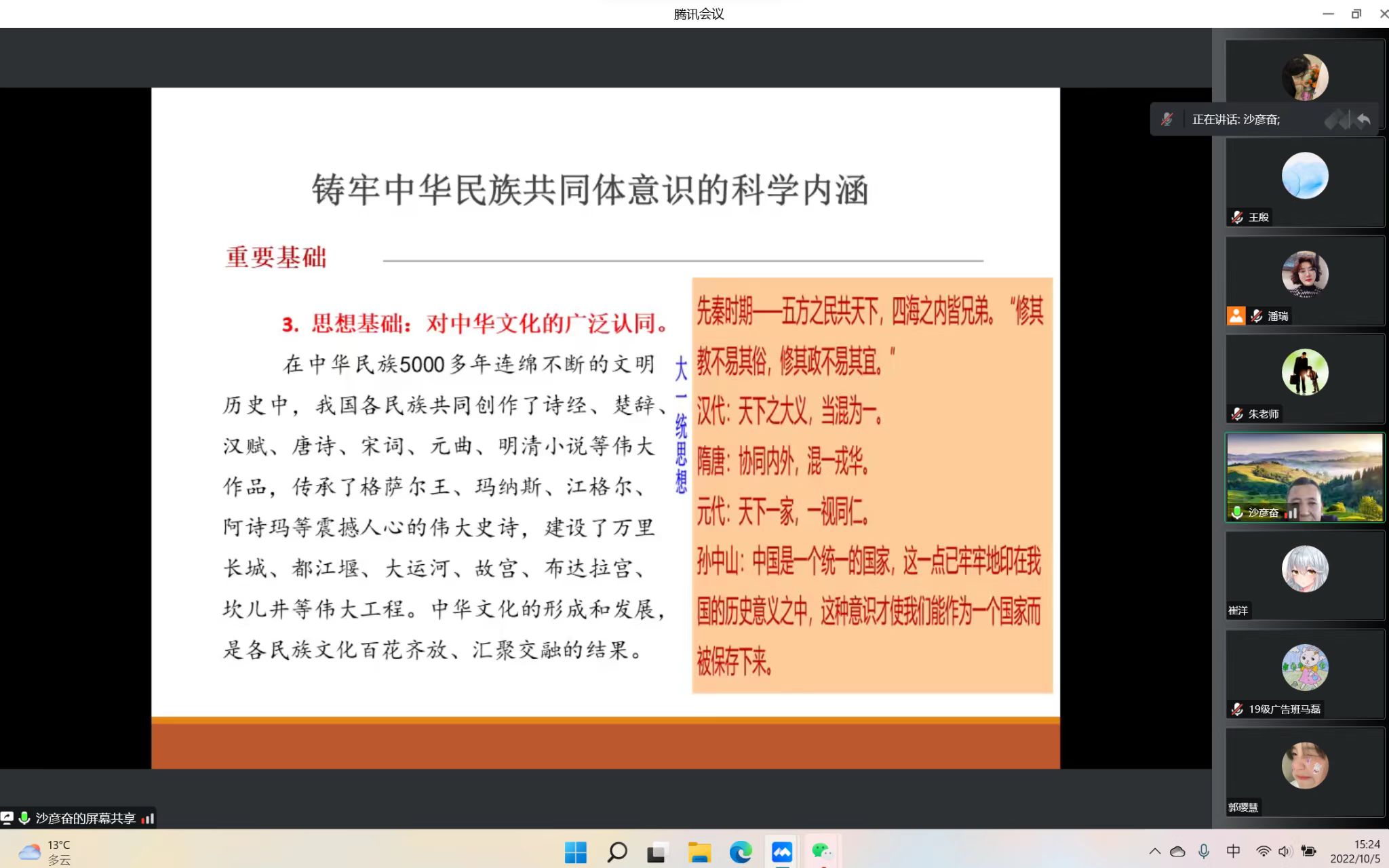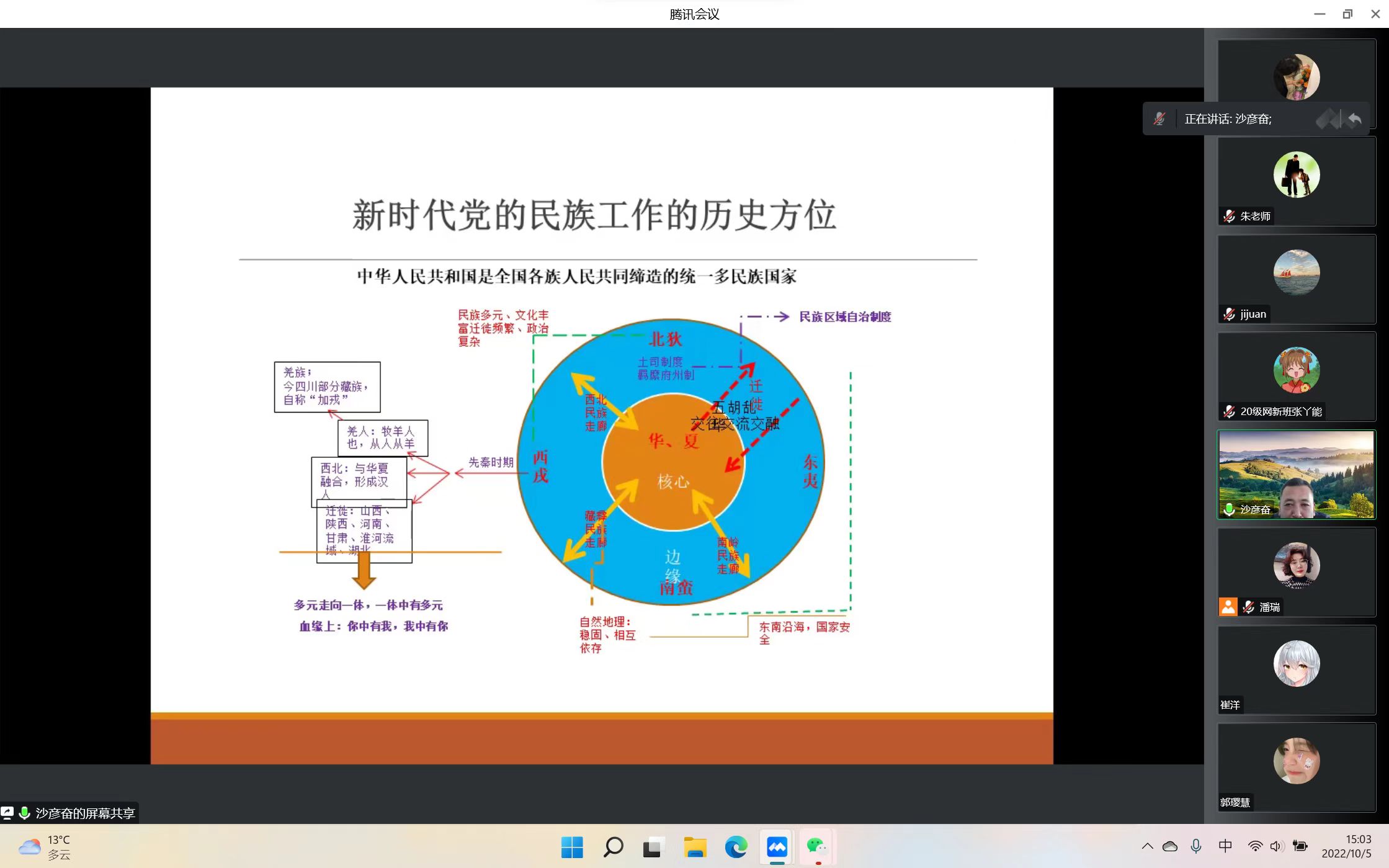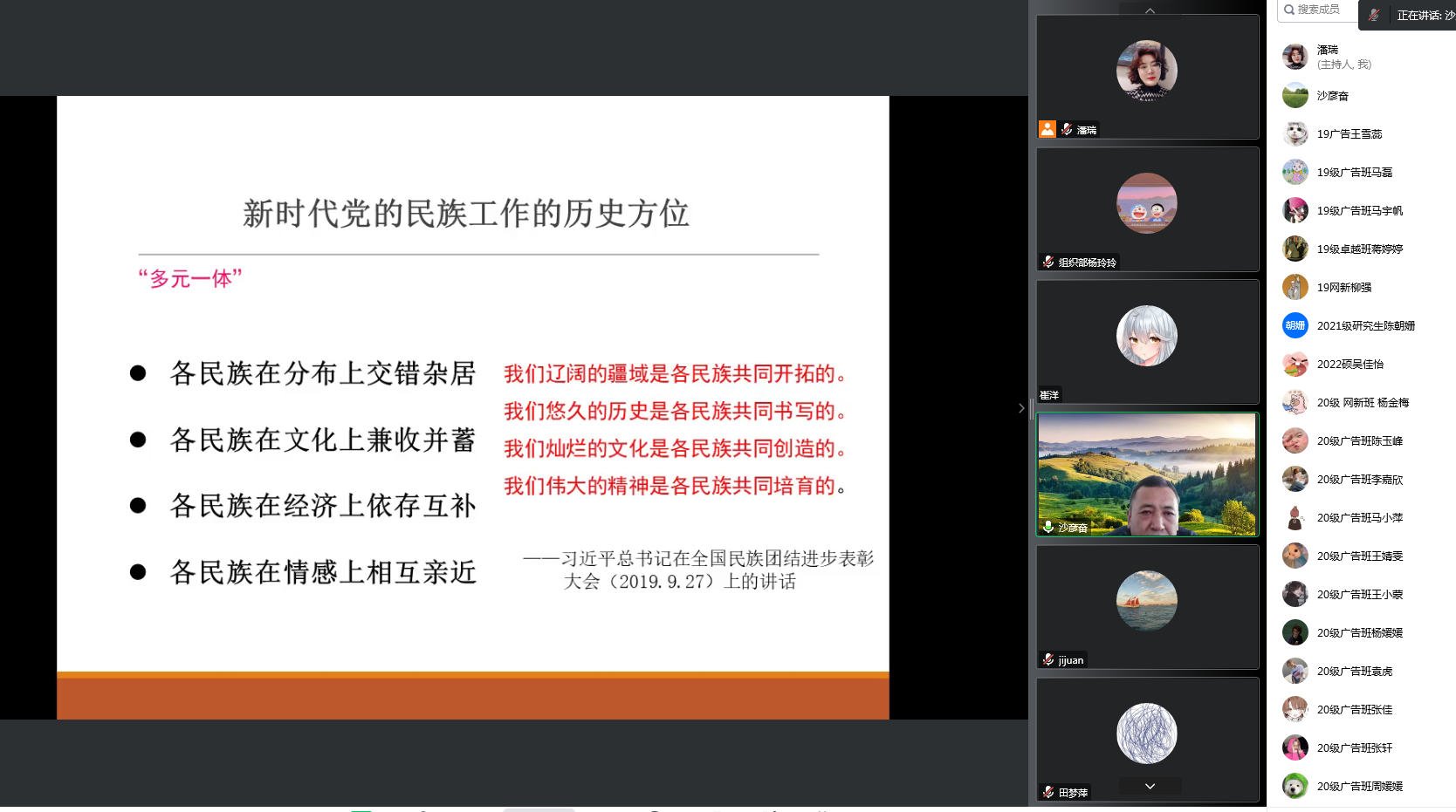 为培养学生的爱国情怀、激励全体师生振奋精神、夯实铸牢中华民族共同体意识根基,10月5日下午,我院开展了主题为“把握历史方位,铸牢中华民族共同体意识”的线上党课培训。讲座由回族研究院副教授沙彦奋主讲,银河国际