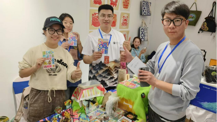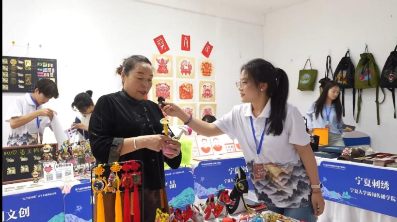 博览会现场,同学们精心布置产品展示区,展示自己的非遗系列作品。这些作品既富有创新性,又蕴含着丰富的文化内涵和宁夏独特的地域特色。在同学们生动的讲解中,不仅将非遗作品背后的故事传播出去,更让观览者感受到宁夏非遗的魅力,同时也收获了观览者的一致好评,支持和鼓励同学们将这一非遗传承下去,传播出去,发扬光大。