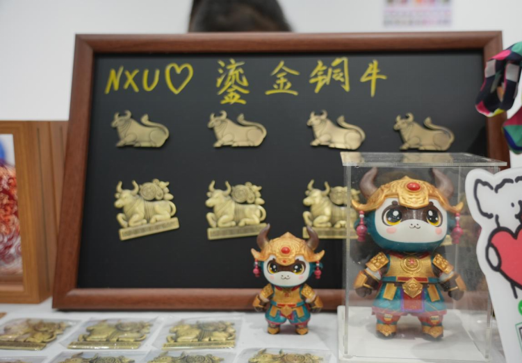 2022级王泰然的鎏金铜牛系列作品以西夏鎏金铜牛为原型进行创作,结合传统文化与现代设计理念,通过AI绘画及现代工艺,创作出新时代承载传统文化符号的产品。冰箱贴、书签、雕塑、手办等等,将古代文化以全新方式融入现代生活,打造兼具实用性与艺术性的文化创意产品。