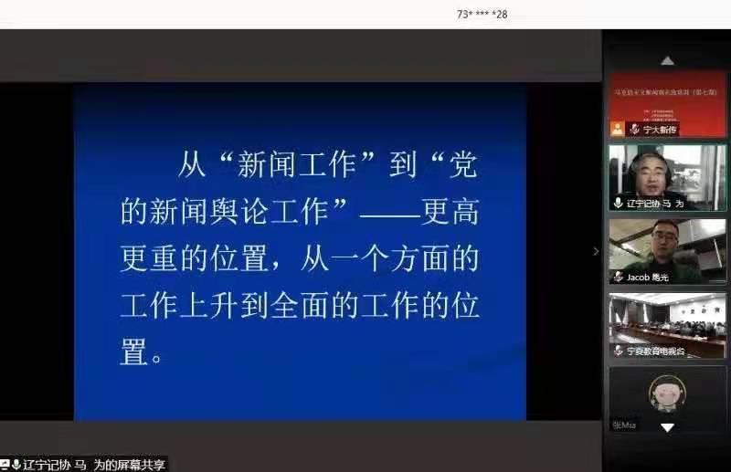 为进一步贯彻学习习近平新时代中国特色社会主义新闻思想,引导全区广大新闻工作者做党的政策的传播者、时代风云的记录者、社会进步的推动者和公平正义的守望者,12月29日下午,由自治区党委宣传部、自治区党委网信办主办,宁夏新闻工作者协会、银河国际 承办的第七期马克思主义新闻观线上培训如期举行。银河国际 执行院长李世举主持,全区各新闻单位在职新闻从业人员、部校共建银河国际 师生、县级融媒体中心工作人员参加了此次培训。
