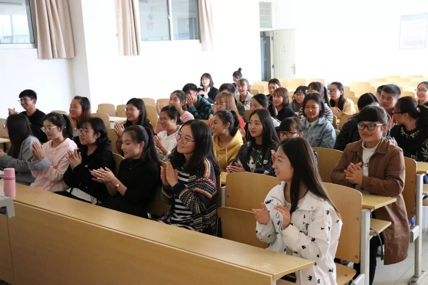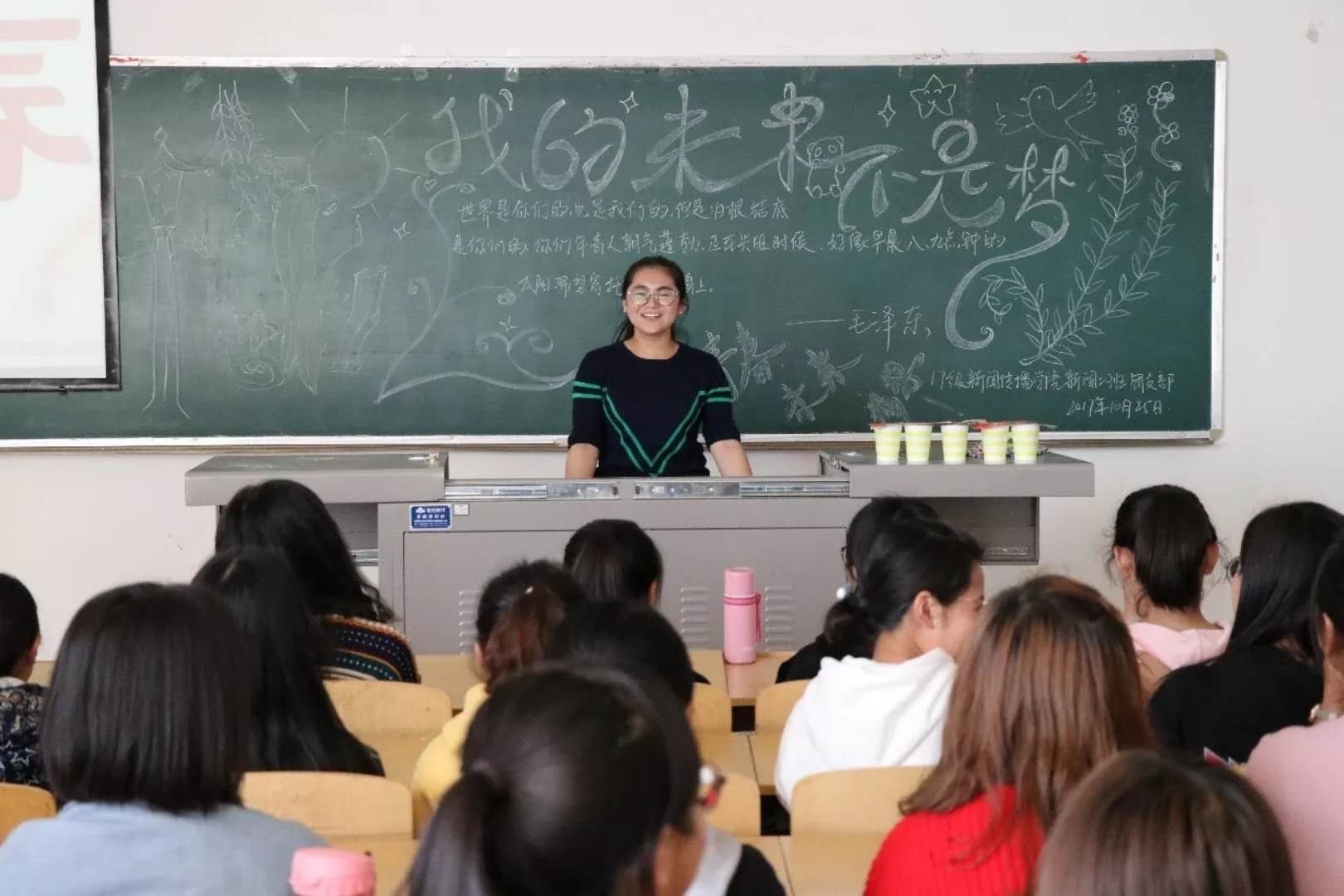 新闻二班团支书为大家诵读了毛主席的青春名言。伴着张磊《年少如风》的悠扬歌声,团支书和班长分享了他们的青春。同学李雯娜说:”青春有欢笑、有泪水、有满足、有遗憾。”马若凝说:“青春中有你有我,我们共同努力。”马萍同学发表了主题演讲《我的青春,我的大学》。演讲结束后,团支书给大家分享了歌曲《曾经的你》,并教大家学唱。全班同学在许巍深情的歌声中回忆着过去的时光,期待着未来!