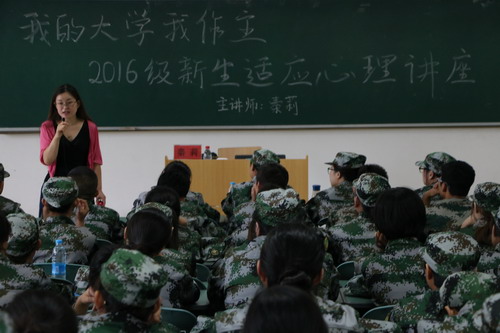 学生处心理中心的秦莉老师为2016级新生带来了以“我的大学我做主––新生心理适应”为主题的讲座。她为同学们仔细分析了大学生心理健康的相关知识。让同学们意识到个人心理健康的重要性,让同学们学会从心理学的角度出发描绘自己大学生活的蓝图。在秦莉老师的安排下,每一位新生积极完成人际交往任务小游戏,锻炼自我,勇于表达。