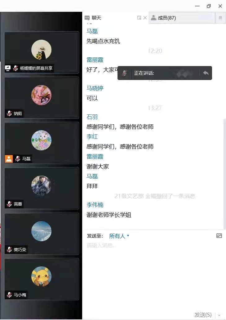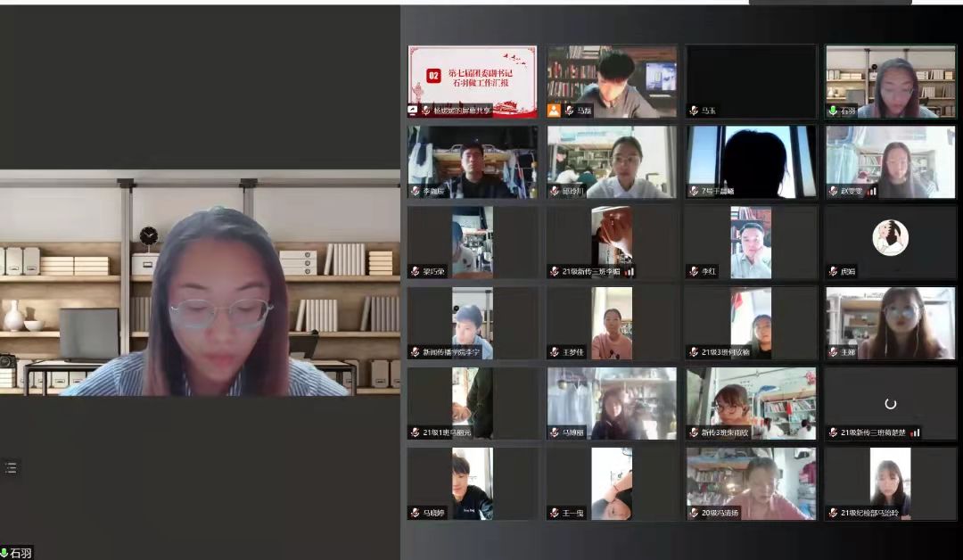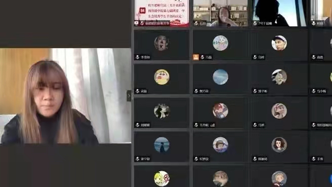 第七届团委、学生会中期调整暨表彰大会”线上会议。本次会议由宣传部主要负责人纳茹主持,学生工作办公室主任雷丽霞、辅导员杜玥、辅导员助理于晨曦出席,团委、学生会全体成员、各班级班委参加。