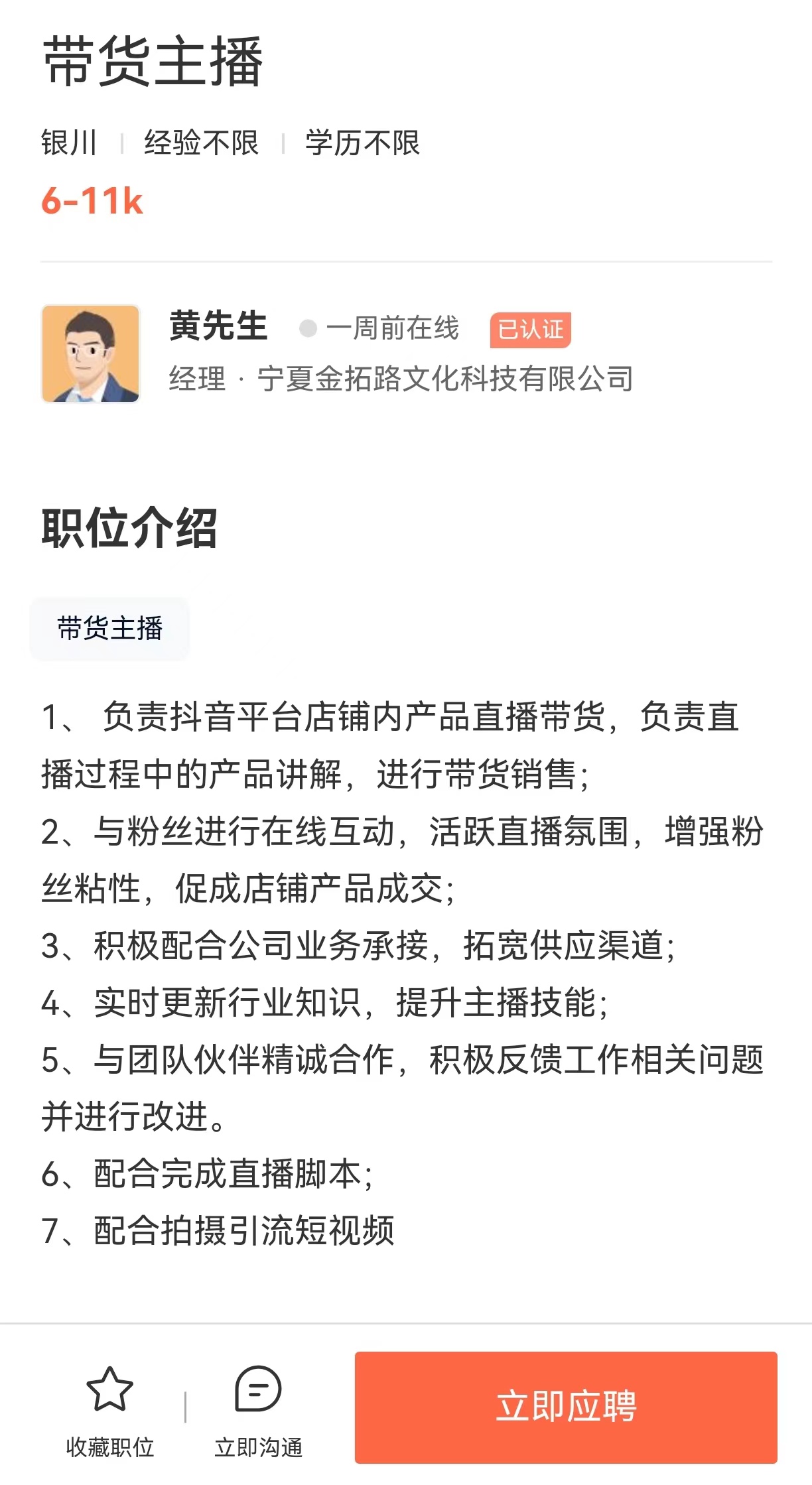 6、岗位:带货主播