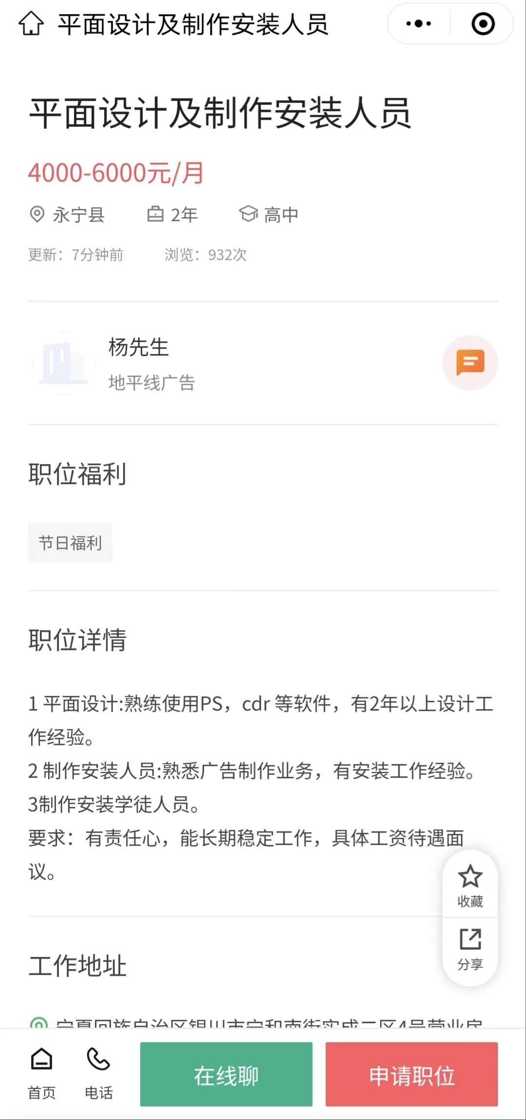 岗位:平面设计及制作安装人员