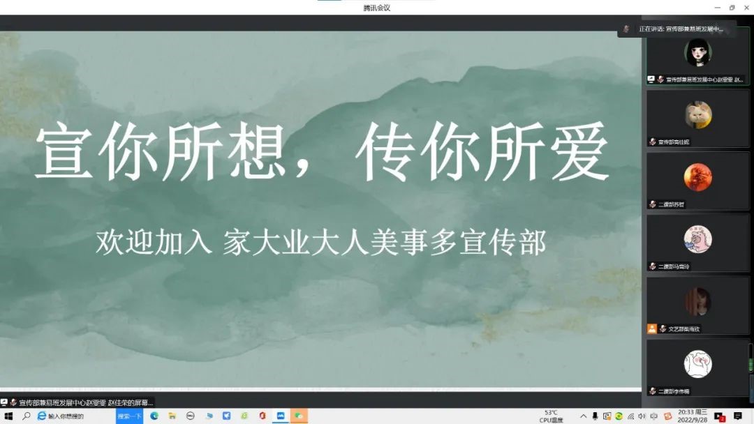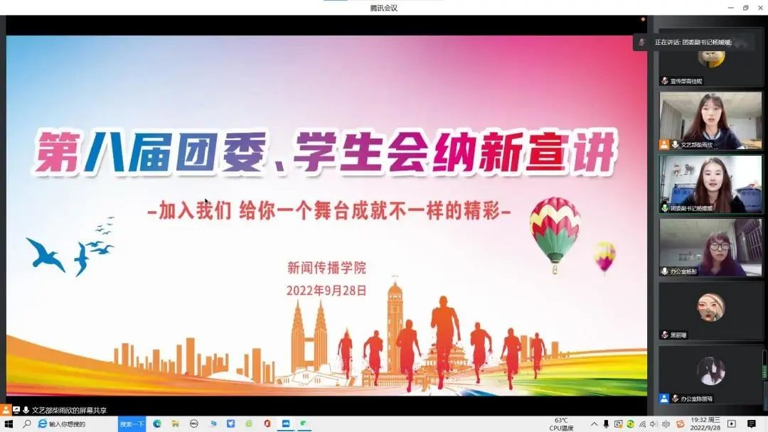 团委、学生会各部门的了解,鼓励同学们积极加入团学组织,9月28日晚,我院开展第八届团委、学生会纳新线上宣讲会。办公室工作人员2021级杨彤和文艺部工作人员柴雨欣主持宣讲活动。