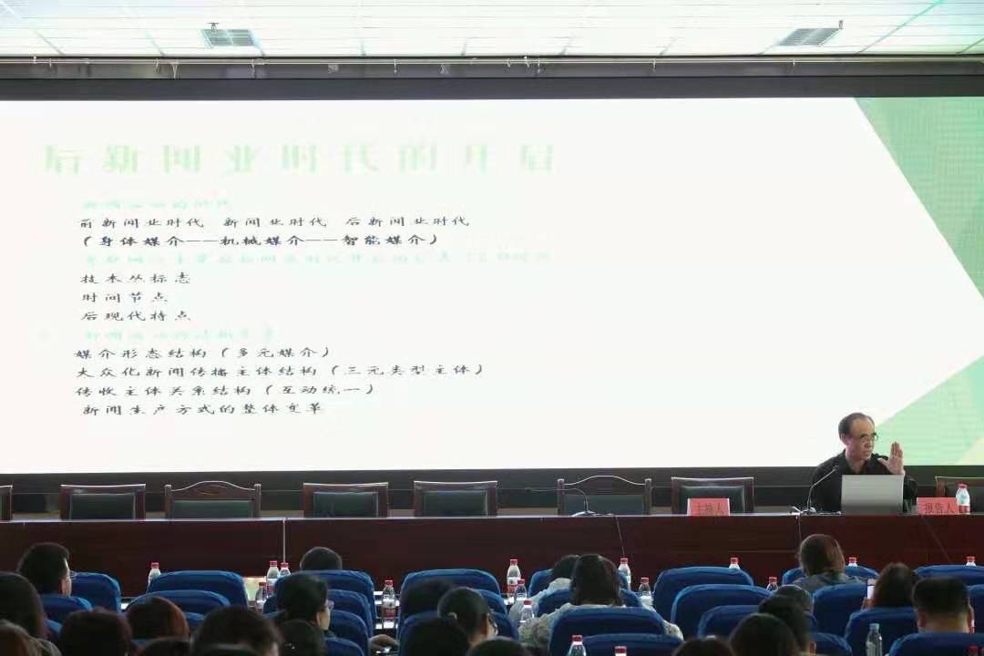 教授杨保军,开展以“当代中国马克思主义新闻真实观的典型特征”为题的讲座。杨保军教授以问题“什么是真实,什么是事实?”引出了“后新闻业时代的开启”的讲座内容。杨教授谈到,现在我们站在了新闻业时代和后新闻业时代的交界处。后新闻业时代的大门刚刚向人类展开,就已经出现了很多问题,这就需要大家不断的思考和探索,回望历史,走好当下,展望未来。