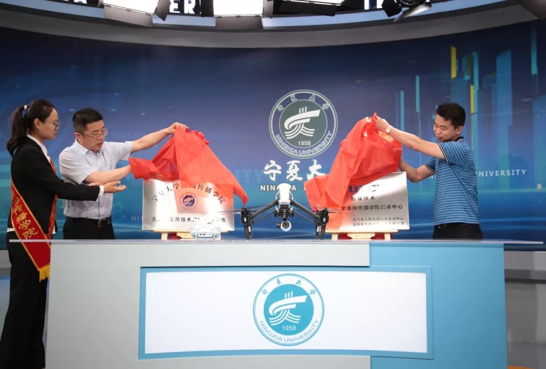 无人机应用技术教学实训基地揭牌,并由李院长为大疆创新宁夏政企行业代表益翔云禾授牌。