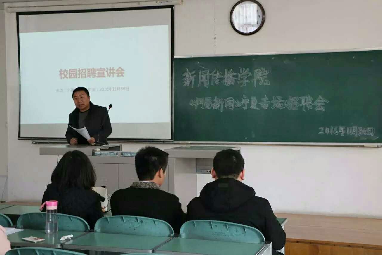 “网易新闻”宁夏站负责人李威威为同学们介绍了网易新闻在宁夏的发展近况,并详细介绍了“网易新闻”对主持人、新闻编辑、摄像师、编导、影视包装师等招聘岗位的职业要求和特点,深入与同学们交流各自的职业发展方向,随后,“网易新闻”新闻部和视频部的两位负责人还分别就文字和摄像提出了实践操作中的要求,使同学们了解到社会新闻单位对新闻专业的期许。