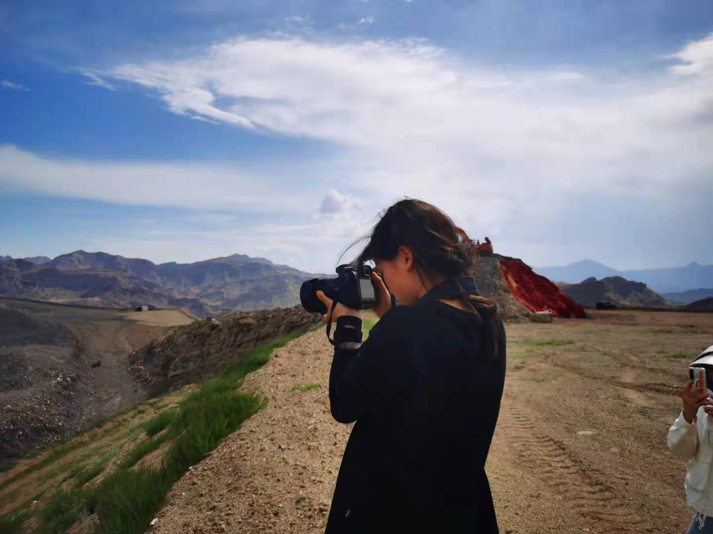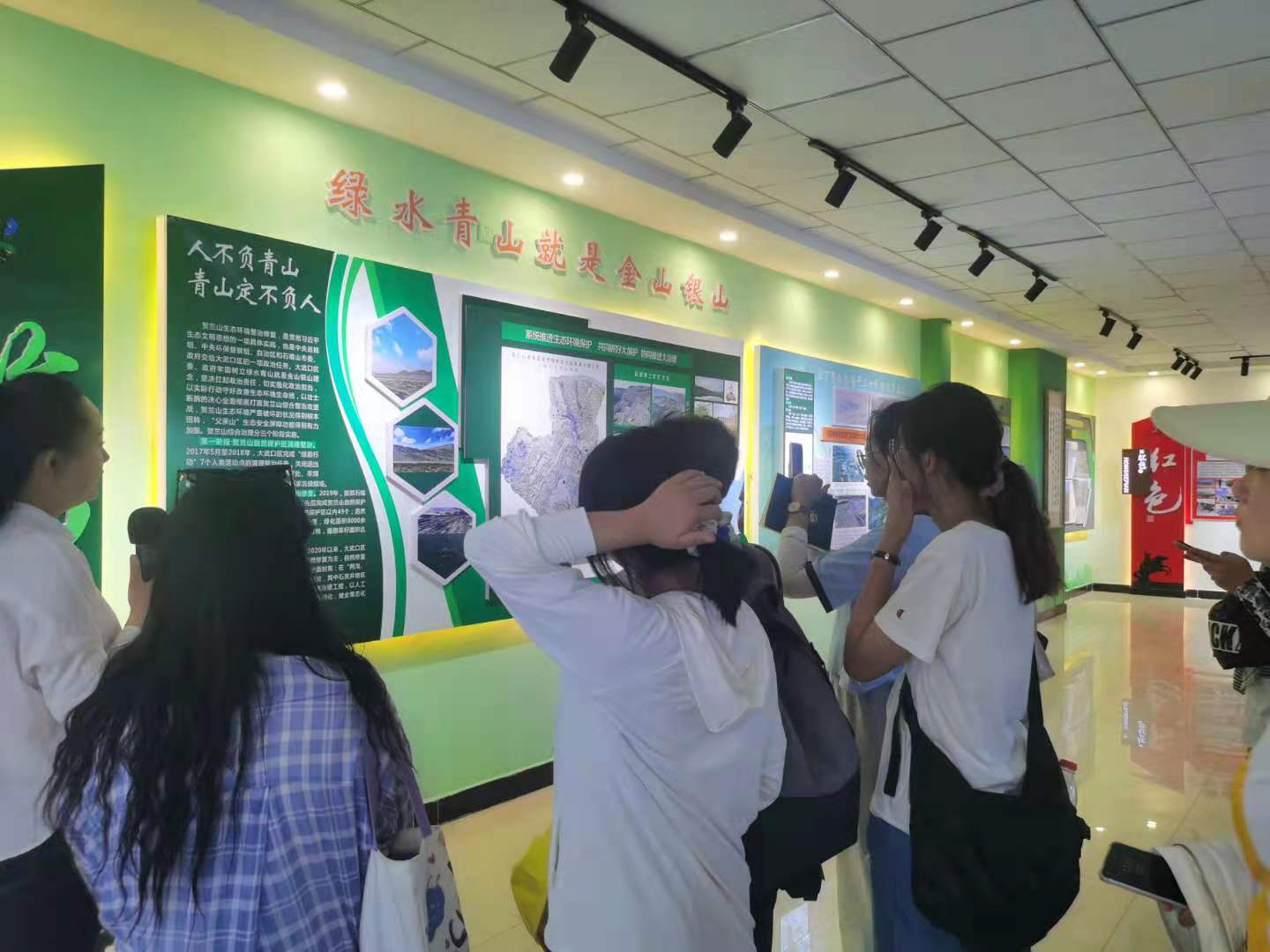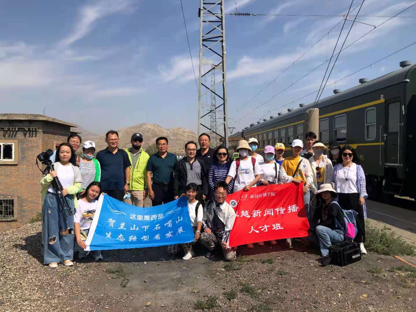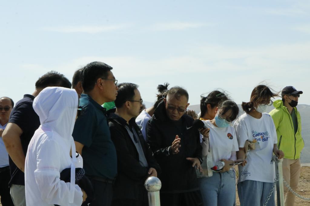 上午九点我们从大武口站出发,乘坐绿皮小火车前往大磴沟站。在乘车期间,同学和火车上的乘客沟通采访、拍摄车内场景,出站后由火车转汽车,几分钟的车程后,就来到了今天的第一站,讲解员为同学讲解了大致情况,当地政府为打赢贺兰山综合治理攻坚战,共关闭退出煤矿39家、非煤矿山61家、涉煤企业582家,退出煤炭产能1600万吨,完成治理面积146平方公里。同学们认真聆听后提出问题、给予反馈,对该区域的生态治理有了更为深刻地认识,牢固树立了绿水青山就是金山银山的理念。与此同时,同学们进行大量的拍摄工作。