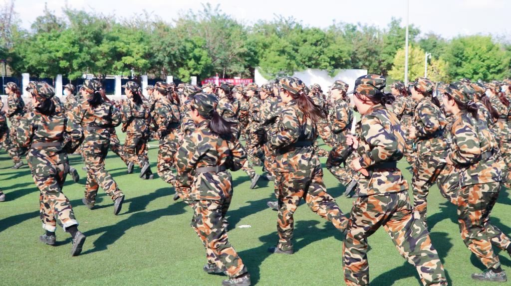 匕首操的千人方队在操场上一遍遍练习,“格斗准备!”、“杀!杀!杀!”,一个个标准的动作伴随着一声声口号响彻操场,女声铿锵,男生雄浑,匕首生风,识要领、知要求、显气魄,匕首操,虎虎生威。他们迎着骄阳,汗水流淌,也毫无疲惫之意,他们目光如炬,挥刀迅猛有力;他们有迎难而上的勇气,气吞山河的气势。