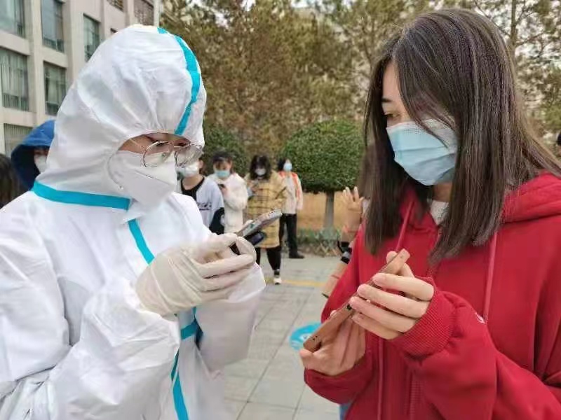 伴随着点点秋雨,疫情防控工作持续进行。学生志愿者引导同学们有序排队,提醒他们提前打开防疫健康码,维护现场秩序,帮助医护人员做好疫情防控工作,构筑起群防群治抵御疫情的严密防线。