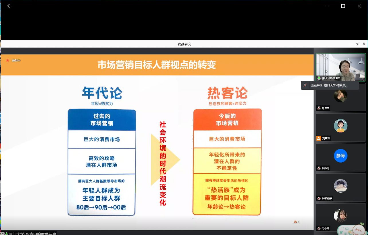 本次讲座,陈素白就身处时代变化潮流中生活者呈现出“年轻化”的趋势引出“热活族”概念,并针对这种趋势提出对应的市场营销视点,分析企业在时代潮流中,如何实现持续稳定增长。同时也探寻和深挖了生活者的“年轻化”意识并鼓励同学们朝着年轻化的趋势不断前进。
