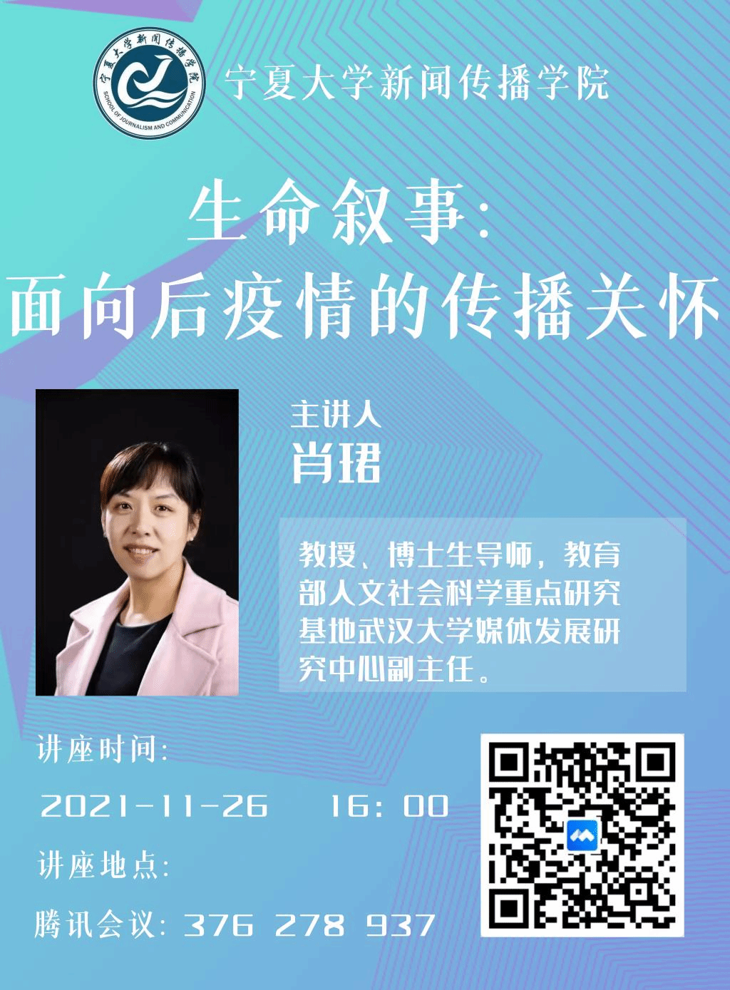 主讲人:肖珺,教授、博士生导师,教育部人文社会科学重点研究基地武汉大学媒体发展研究中心副主任。主要内容:对生命叙事研究进行初步界定,进而从话语、故事、叙述三个角度探讨灾难事件中信息的流动、解读以及生命共同体的建立,倡导未来的新闻传播学学习和研究中尽可能地关怀“人”。