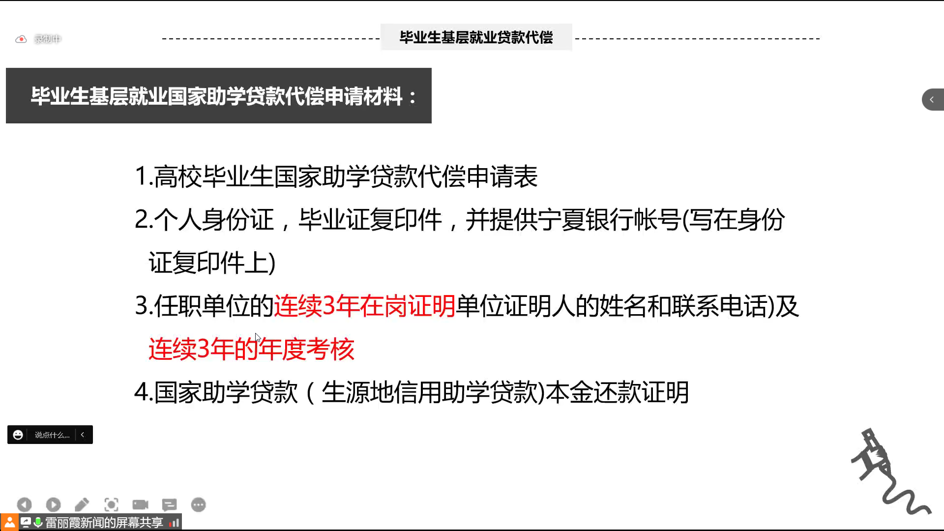 会上,雷丽霞对生源地助学贷款、毕业生基层就业贷款代偿和服兵役高等学校学生国家教育资助政策进行宣传,并对毕业生网上发起毕业确认、就学信息变更和续贷声明三项重点工作进行了讲解。