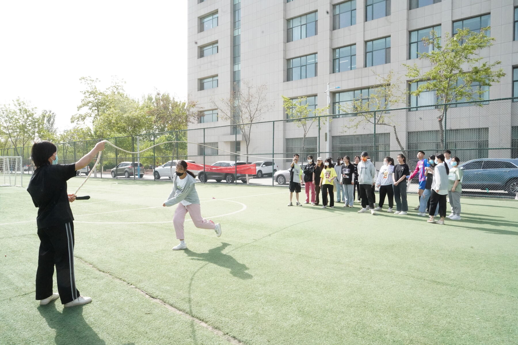 随着大绳的摆动,同学们玩起了“猫抓老鼠”的游戏,你跑我追,不亦乐乎。