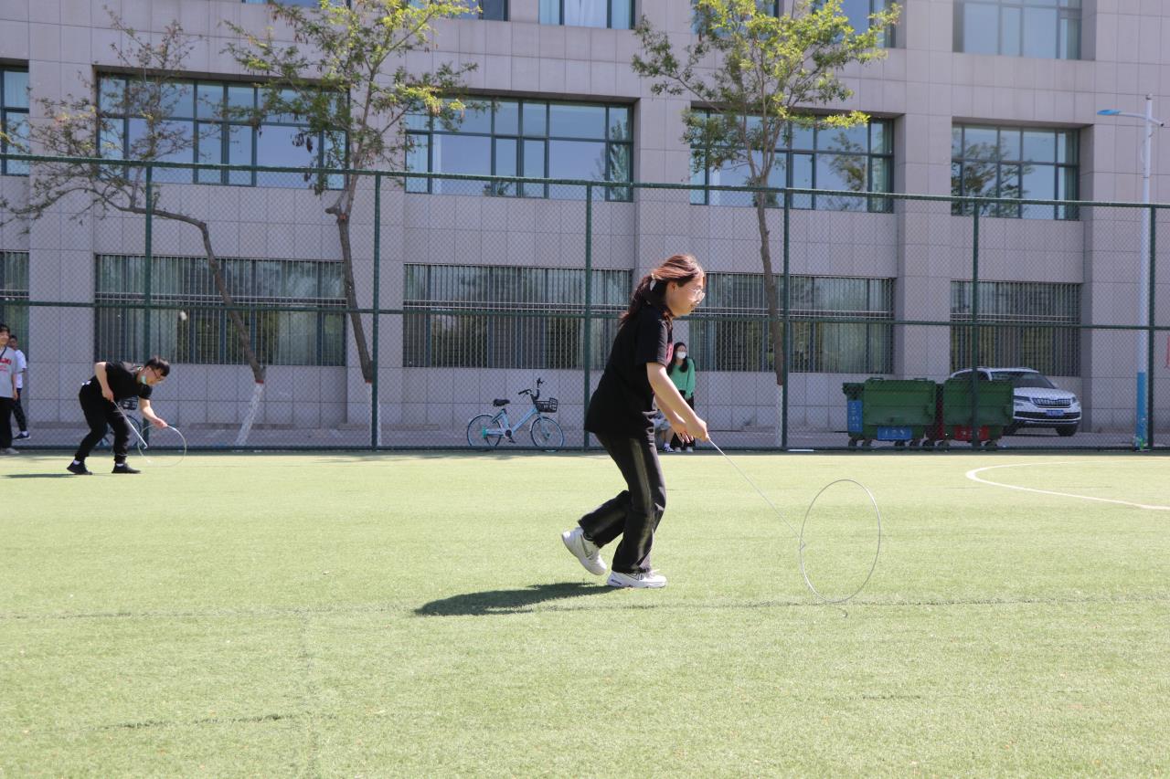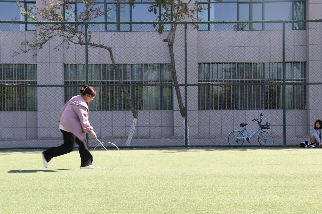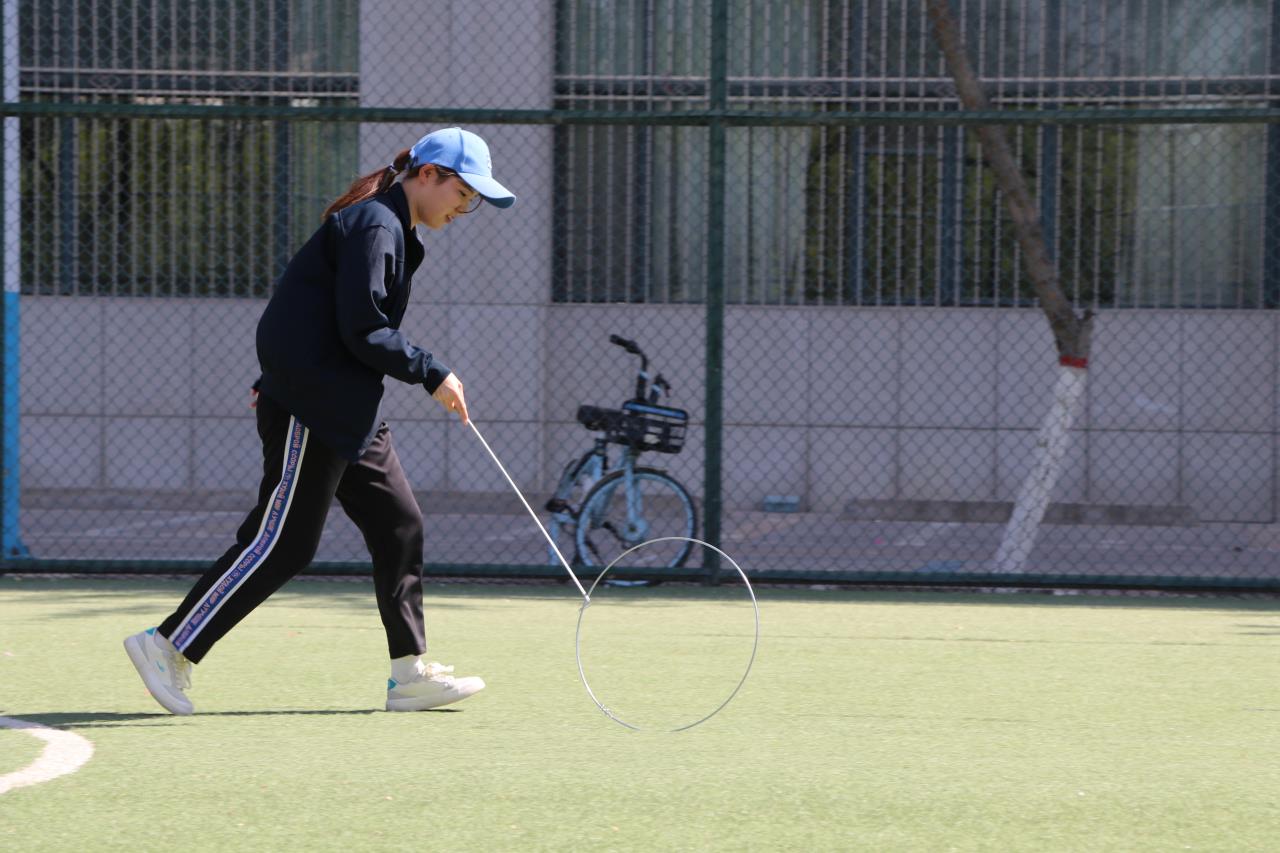小小的铁环,看似简单,操作起来却有一定的难度。同学们分组对抗,配合默契,一个接一个,随着铁环的滚动跑起来。