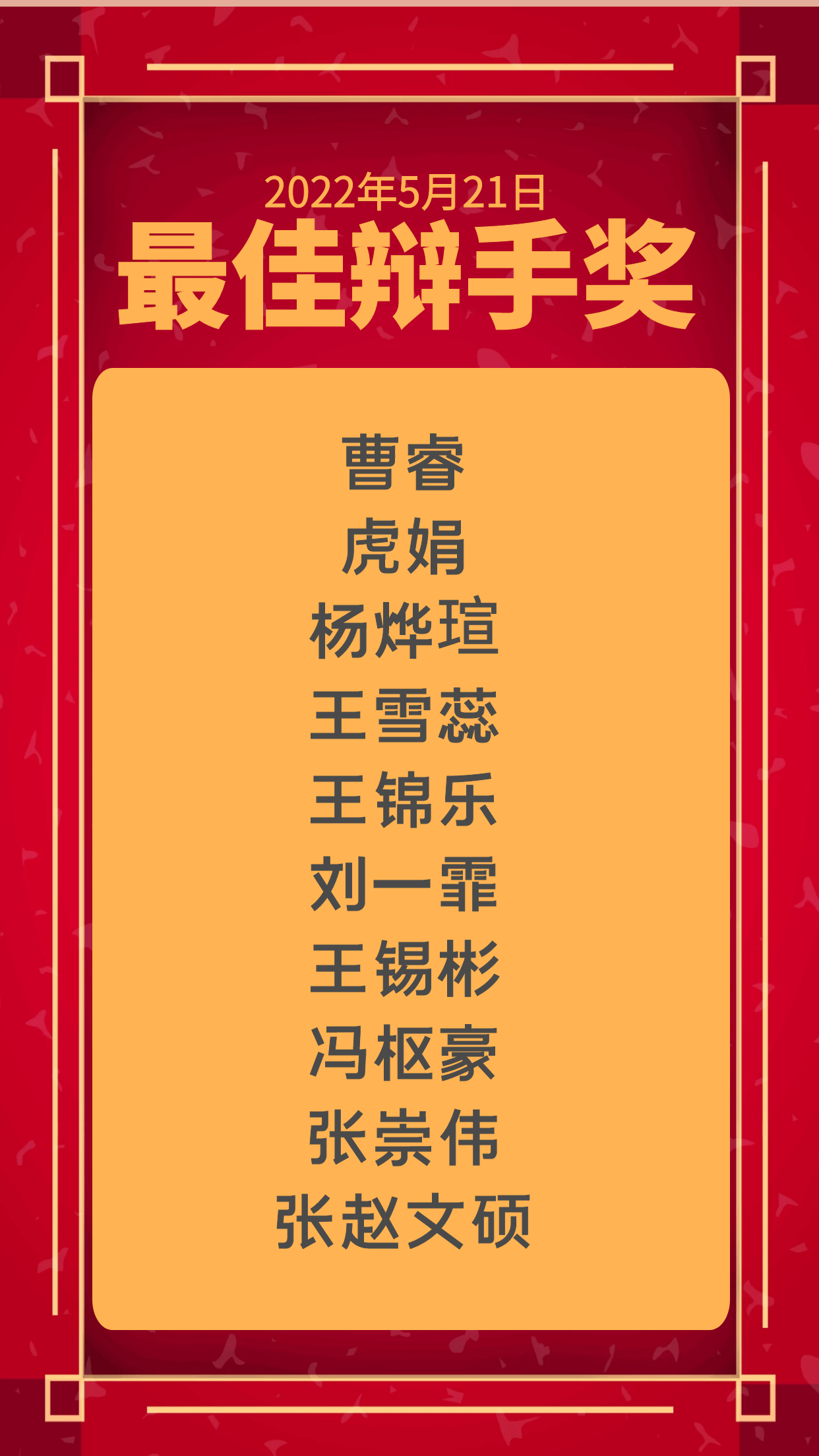 而辩手中也涌现出多位佼佼者。冯枢豪同学临危不乱,在自由辩论中巧舌如簧,风趣幽默,通过对比双方观点进一步为己方立论;张崇伟同学逻辑清晰,思维敏捷,精辟的措辞和犀利的言语燃爆全场;刘璐瑶同学机智干练,面对反方的提问面不改色沉着应对;张赵文硕同学对答如流,在步步紧逼中彰显逻辑奥妙;马帅同学稳健细致,从生活小事出发援疑质理,从容有度。总之,10支队伍的40位辩手用各具特色的优异表现彰显出新传学子敏捷的思维、顺畅的表达和高昂的青春风貌。