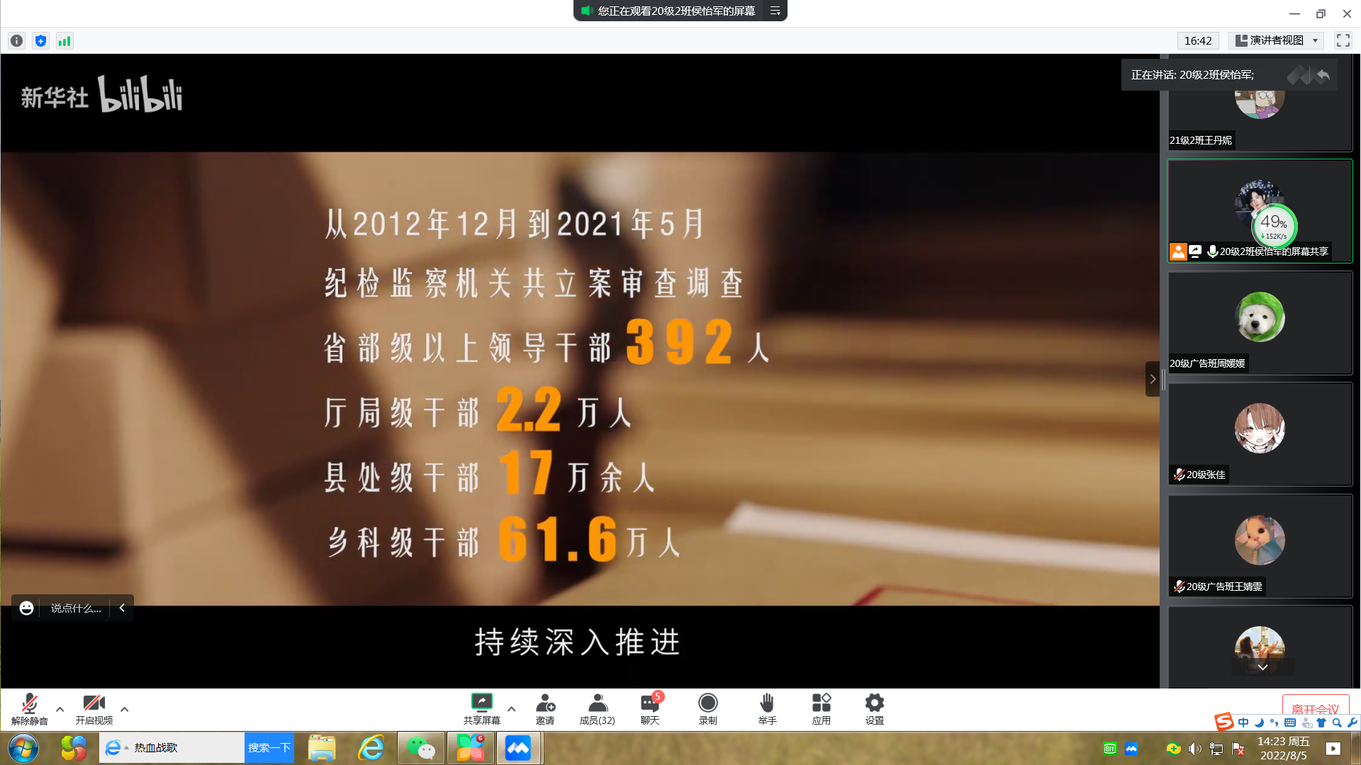 各班在团支书的带领下,从政治、经济、文化等各个层面回顾了新时代党带领中国人民取得的历史性成就,2020级广告班团支书侯怡军播放纪录片《大国抉择》,向同学们讲述我国在面对困难和挑战时一次次艰难抉择背后的故事,从中体会党和国家建设国家之艰辛,取得的成果之伟大。