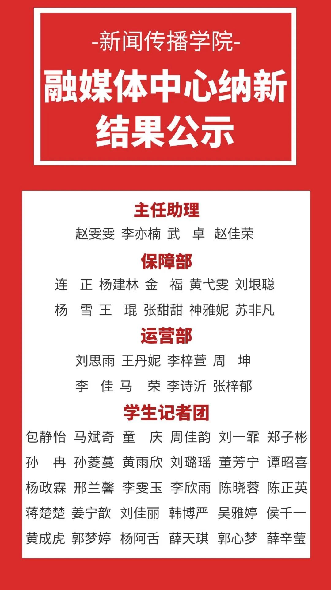 根据银河国际 融媒体中心纳新工作安排,经过前期院团委宣传部纳新、个人申请、面试专家评分、银河国际 党总支考核,恭喜以下成员加入我们大家庭。