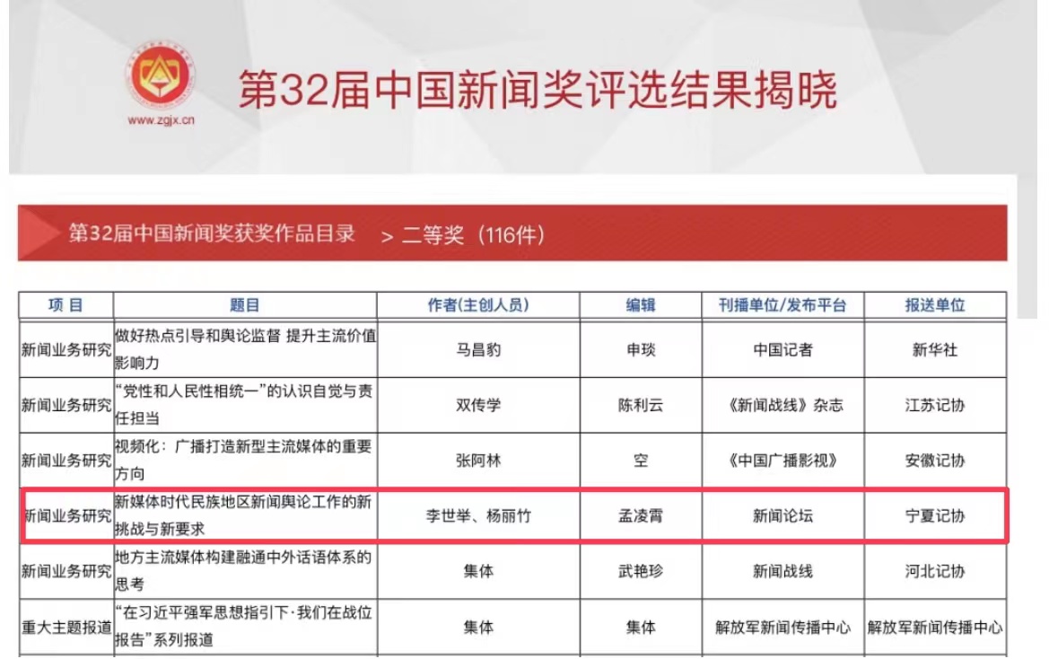 第32届中国新闻奖共评选出15篇获奖新闻业务研究论文,其中一等奖2篇,二等奖5篇,三等奖8篇。《新媒体时代民族地区新闻舆论工作的新挑战与新要求》一文基于民族地区新闻舆论工作的特点与规律、困难与挑战,从理论层面分析了民族地区新闻舆论工作在维护民族团结、国家统一,促进民族地区社会经济发展方面的意义和价值,提出了加强与改进民族地区新闻舆论工作的对策和建议。