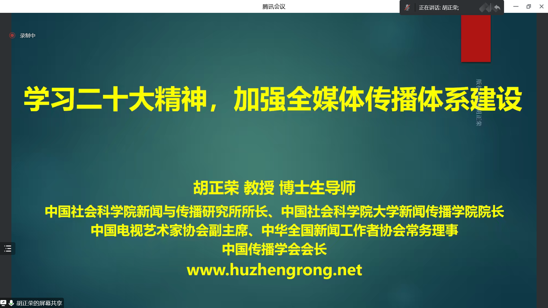 胡正荣教授首先从党的二十大报告中有关加强全媒体传播体系建设的重要论述出发,分析了新时代全媒体建设的内涵和实质,然后从“全媒体传播体系与意识形态、国家安全”、“全媒体与新型主流媒体”、“智慧全媒体传播”三个维度层层深入,进一步阐释了建设全媒体传播体系的重要意义。他指出,媒体安全是政治安全,也是社会安全,在互联网时代,社会竞争的核心资源是数据,要把中国的数据掌握在中国人手中,形成新安全发展格局。
