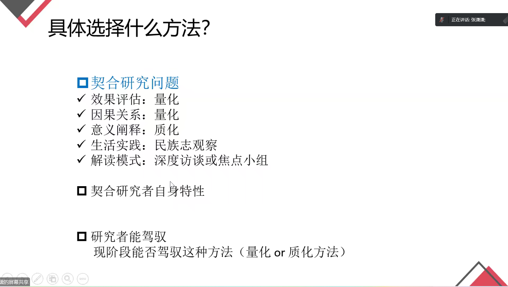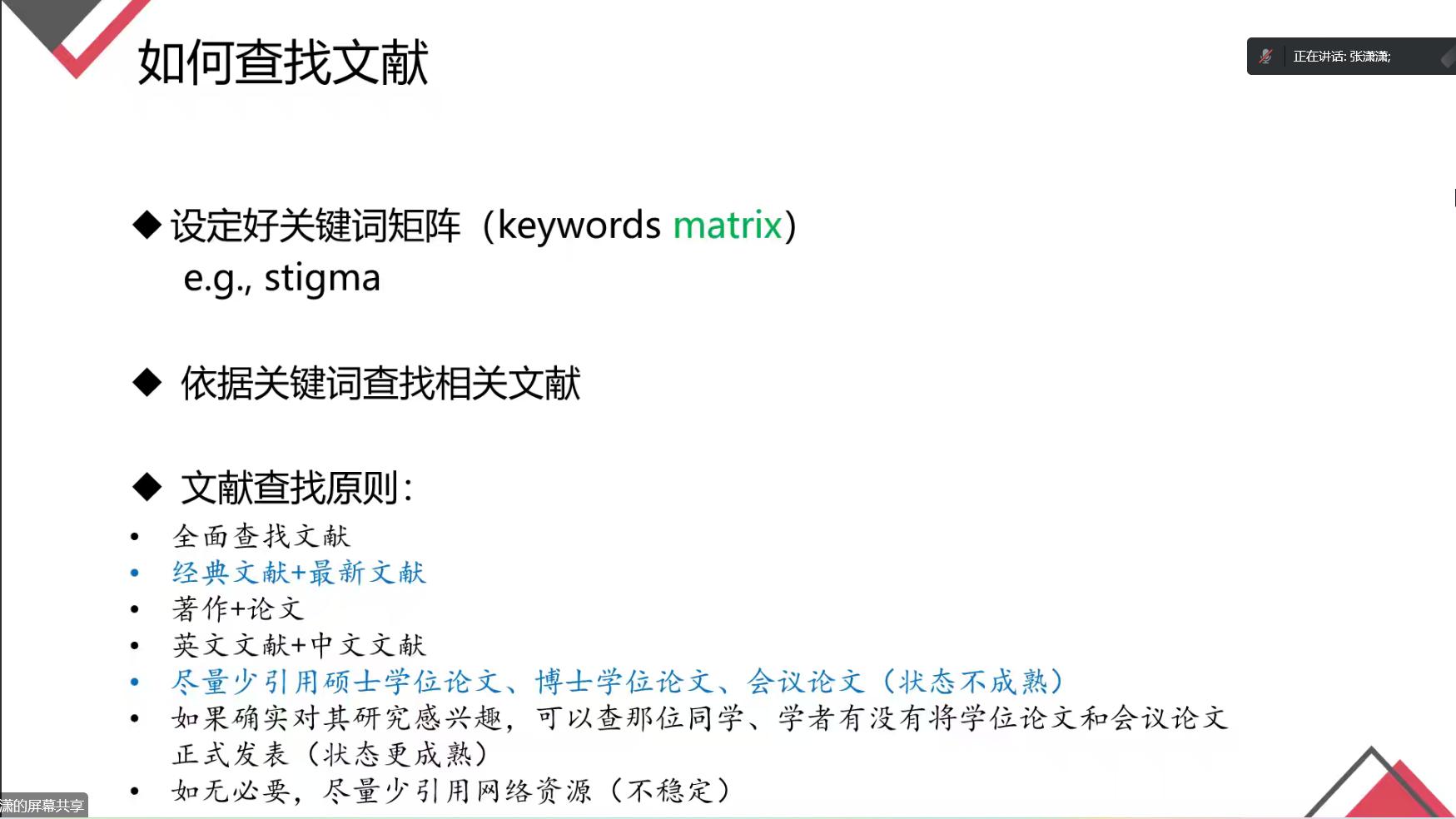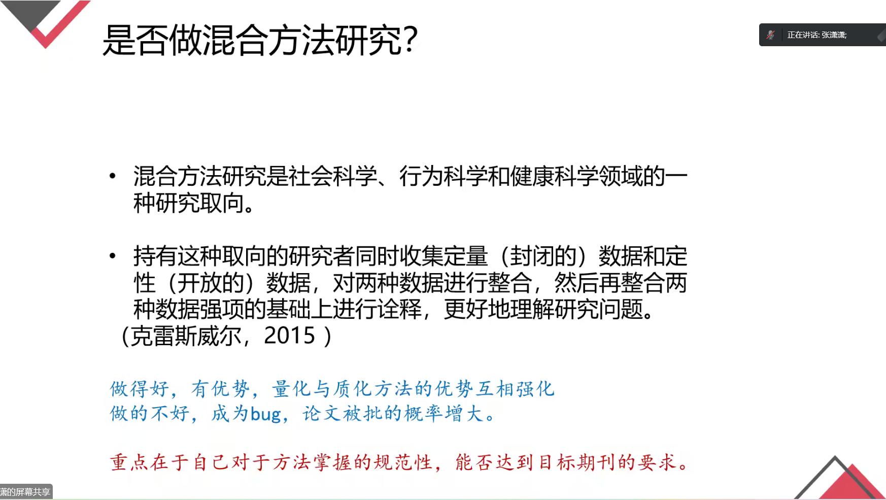 在具体的论文填充写作上,张潇潇就如何查找文献,查找哪些文献,具体选择什么方法、数据收多少合适,是否做混合方法研究等论文写作中常见的问题进行了解答。
