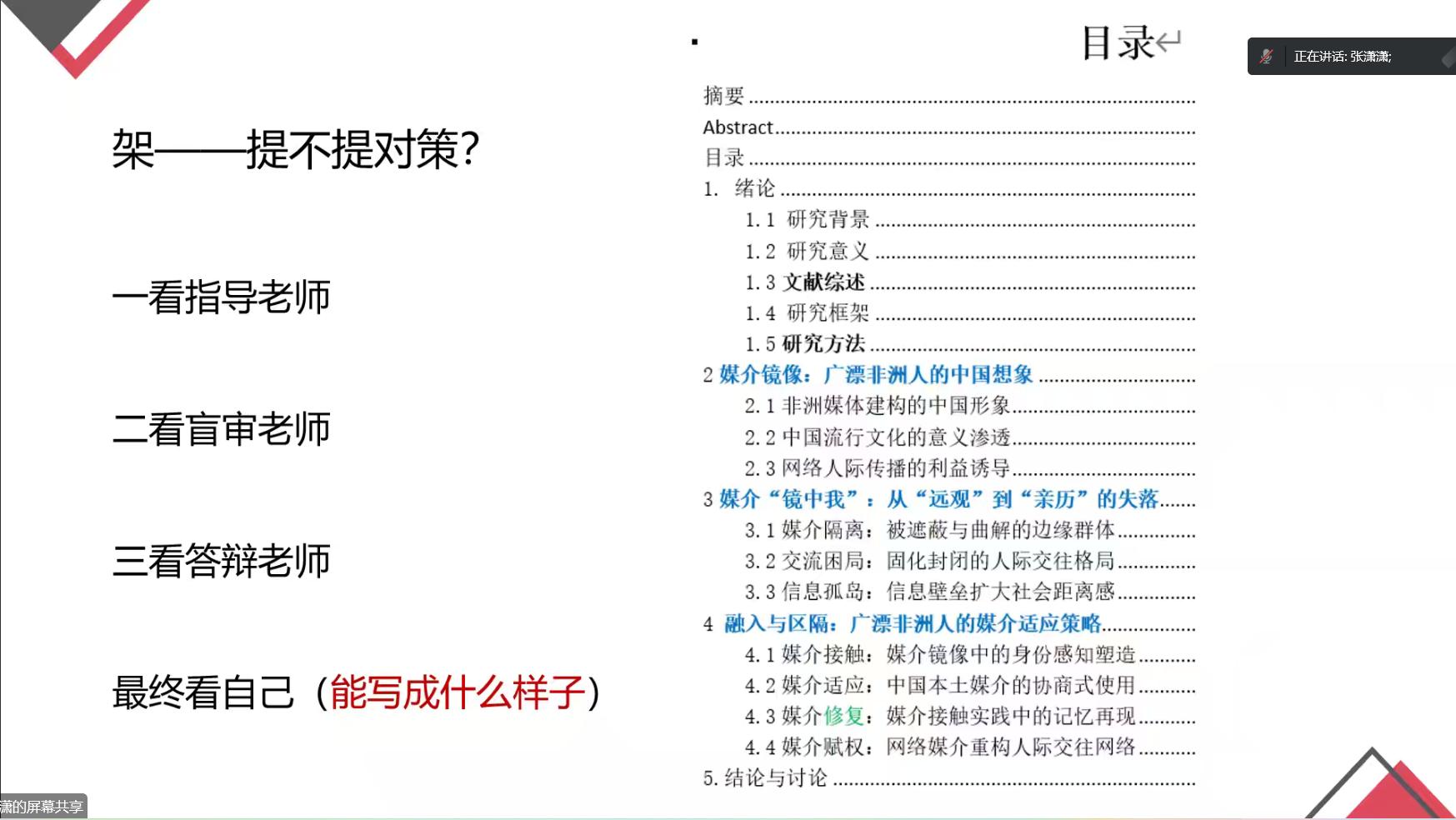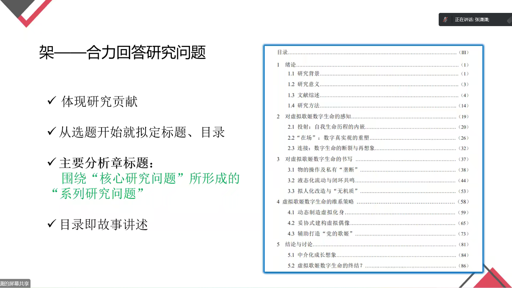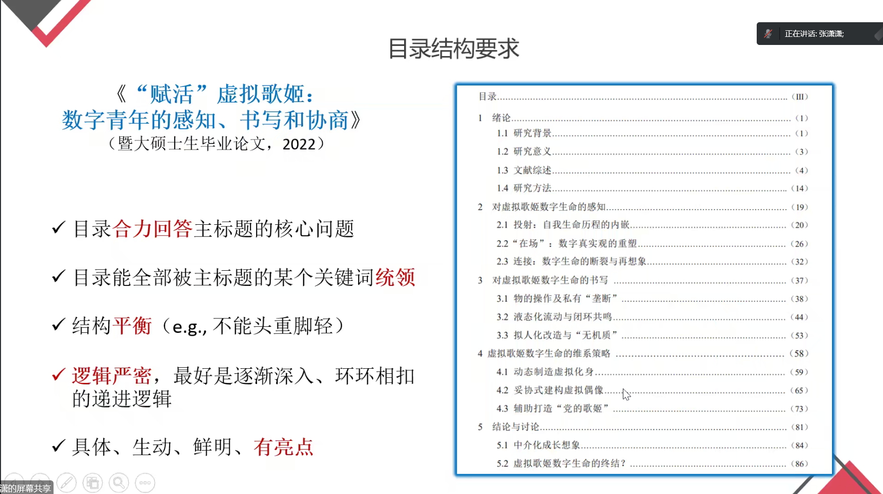 谈及论文架构,张潇潇以毕业论文《“赋活”虚拟歌姬,数字青年的感知、书写与协商》为例,指出论文架构要合力回答研究问题,目录写作要合力回答主标题的核心问题,能全部被主标题的某个关键词统领,结构平衡,逻辑严密,具体、生动、有亮点;她建议论文架构要体现研究奉献,从选题开始就拟定标题和目录,主要分析章标题,每个章节下至少要有三个小节;关于要不要提对策,她指出要兼顾指导老师、盲审老师和答辩老师。