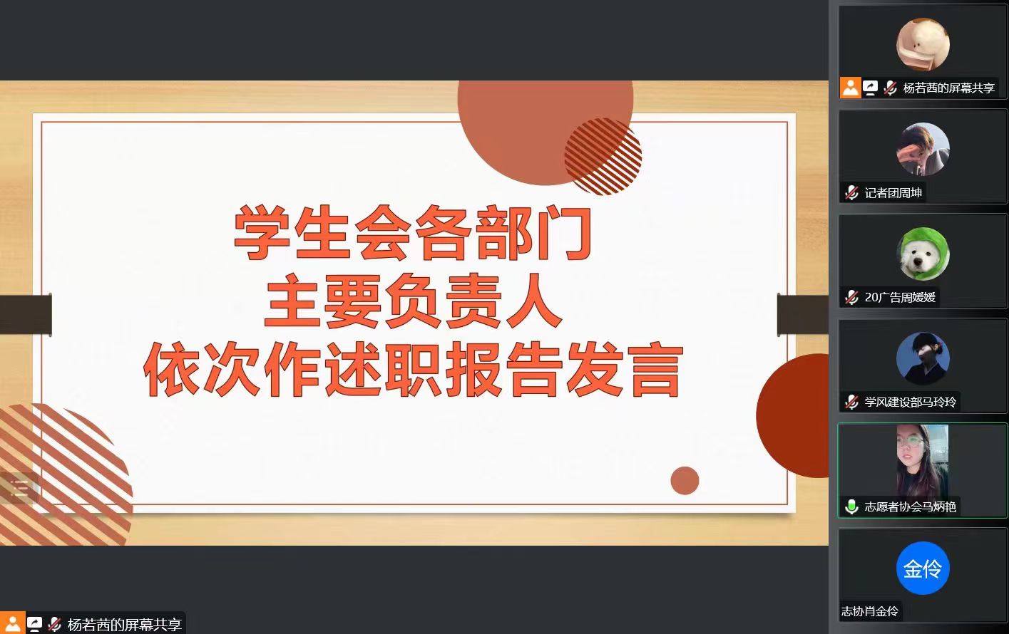 首先由主席团成员进行述职,各部门主要负责人依次述职。学生会主席团成员周媛媛汇报了本学期学生会组织的主要工作及改革情况。