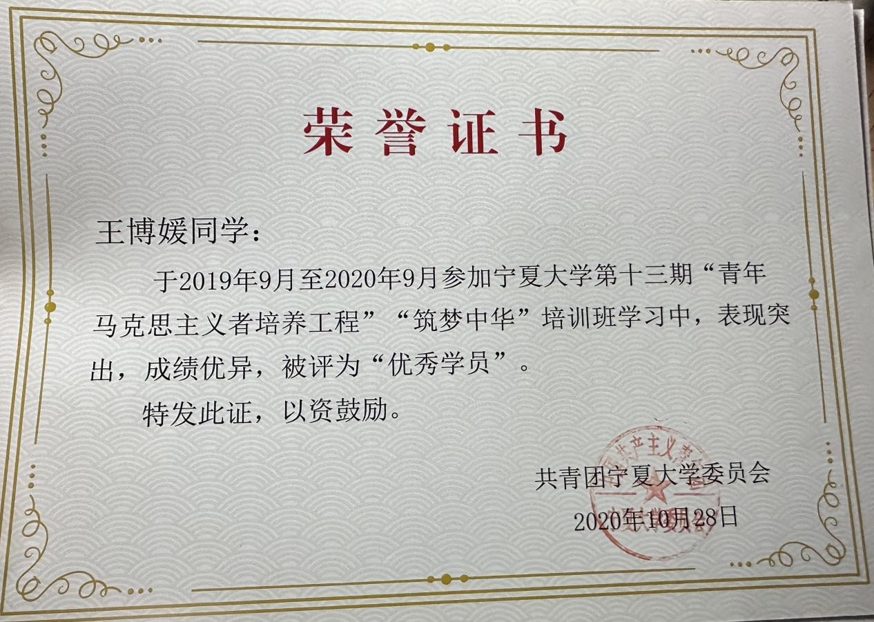 王博媛的荣誉证书