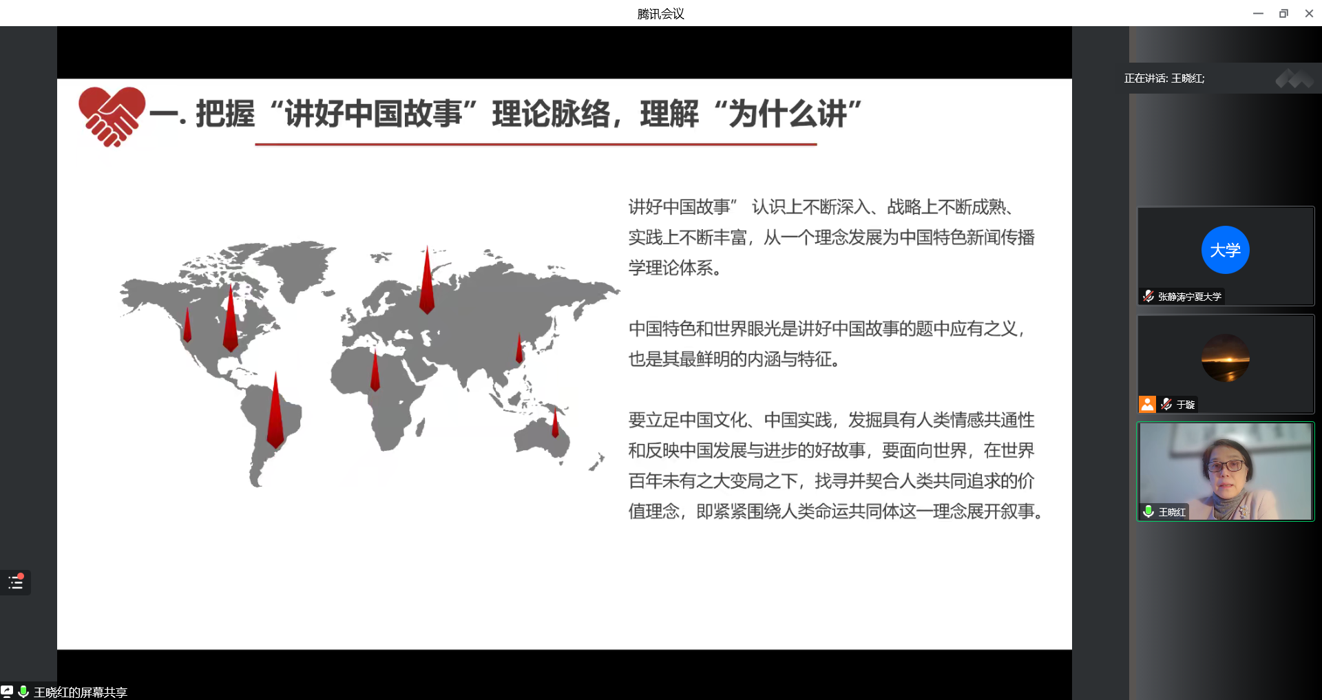 王晓红首先从目标任务、责任使命、话语体系、方法路径、叙事策略五个纬度带领大家梳理“讲好中国故事、传播中国声音”这一理论的发展脉络,并结合中国十年间的实践工作阐明了“为什么要讲好中国故事”这一重要课题。她指出,“讲好中国故事”是新时代加强国际传播能力的现实需要,更是向世界展示中国理论、中国思想的窗口。