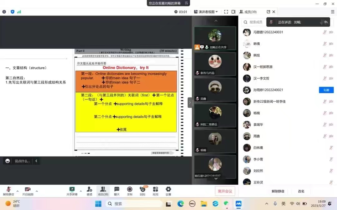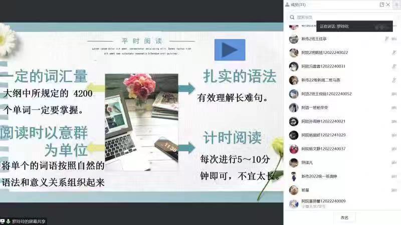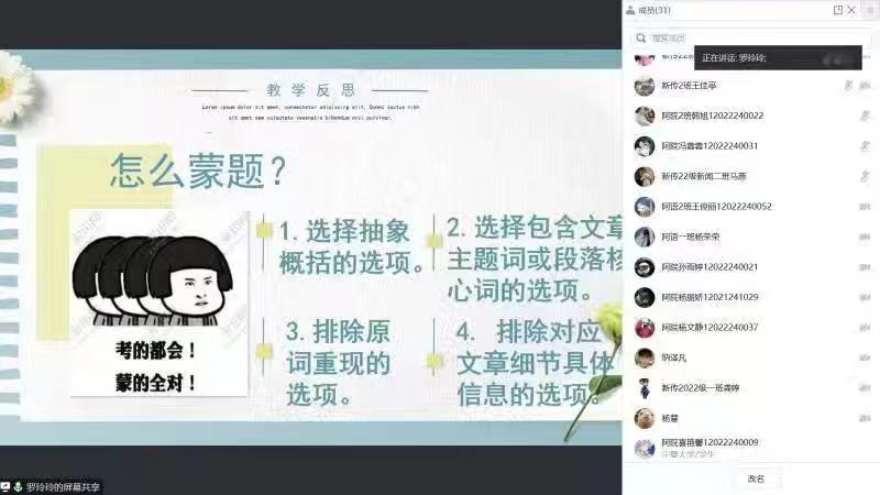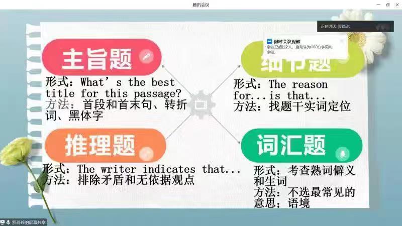 活动伊始,刘畅同学就六级考试流程、题型分析以及评分标准进行了详细讲解。她提到关于单词部分最好可以从真题中找到高频词汇重点识记,每日定量背诵复习,加强词汇量的积累。并强调日常训练做题时要严格把控时间,有意识地提高做题速度,避免在考试时出现时间不够用的情况。