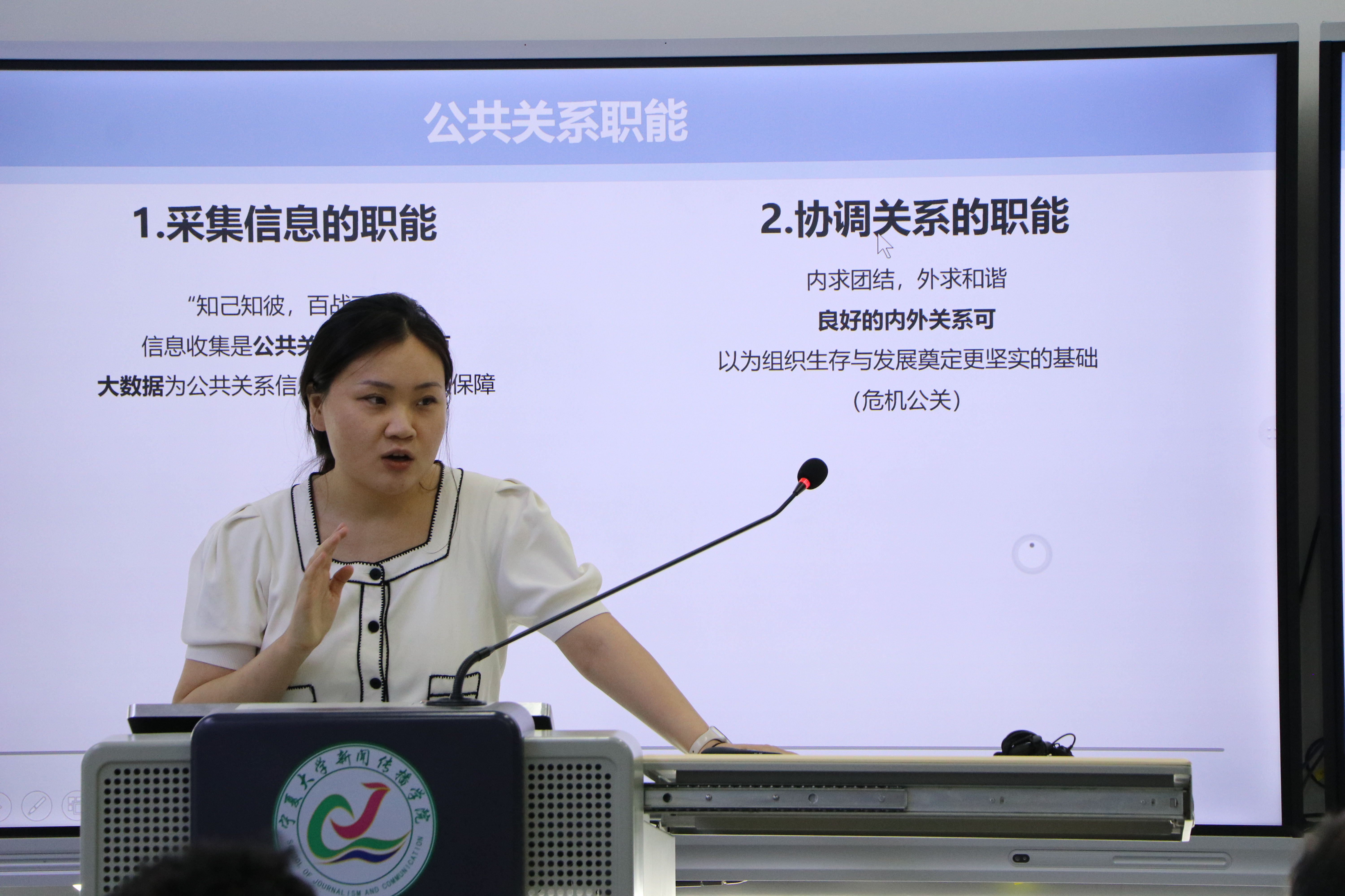 杜玥老师带领同学们回顾上节课的内容将两节课的知识自然地过渡,再以疫情期间软件“钉钉”面对大量低分的诙谐回复视频为例,将公共关系的四大职能进行了分析与讲述,并利用经典案例让同学们进行积极思考。