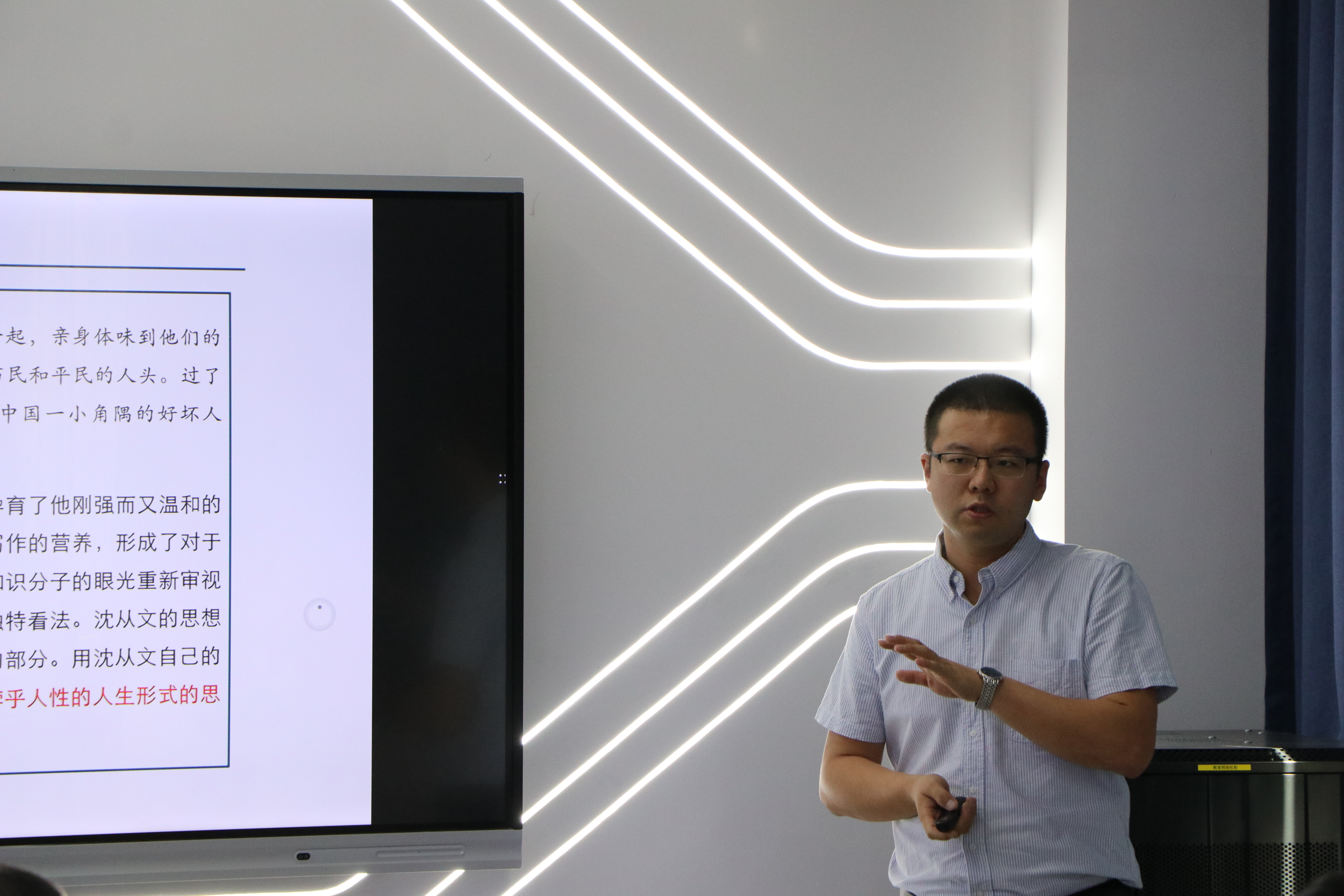 徐舒老师在上课之初首先梳理了上一节课的教学内容,再借由沈从文的生平经历带领同学们走入沈从文的报人经历,从而让同学们了解沈从文在大公报·文艺副刊担任编辑期间对其文学创作的影响。