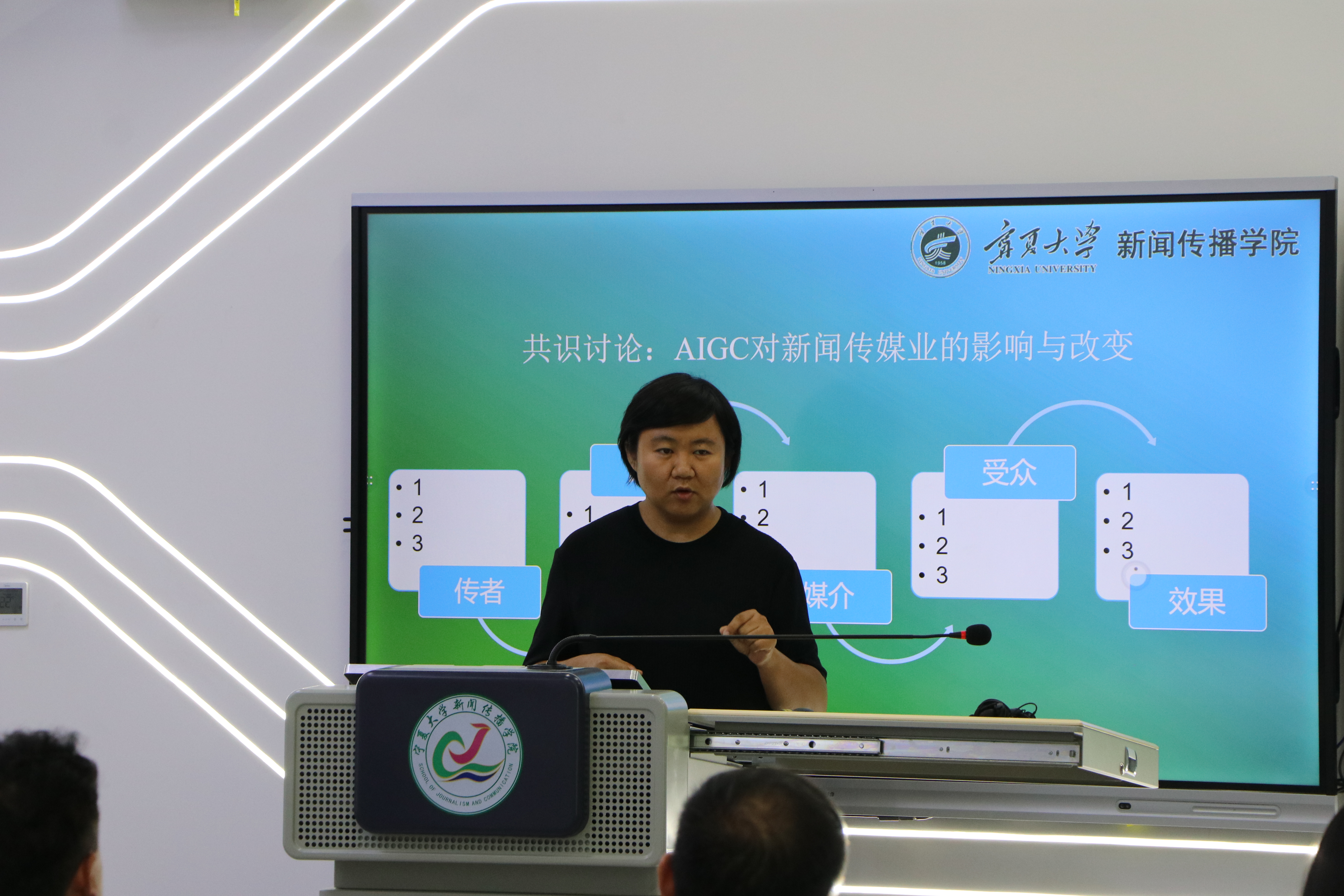 于璇老师的授课是以一张中国传媒产业20多年来首次负增长的统计图中引出互联网对新闻传媒业的影响与改变这一课堂主题,并将AIGC作为抓手,对比传统传媒的生产流程突出了互联网对新闻传媒业的巨大影响。