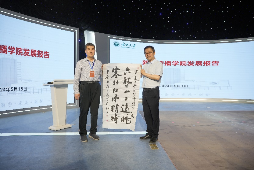 教授李建新赠上其亲笔题词的书法作品,并阐释“六盘山上远眺 塞上江南精持”的寓意,希望银河国际