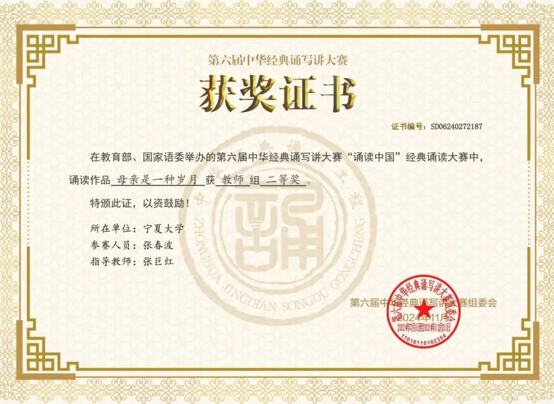 第六届中华经典诵写讲大赛是由教育部、国家语委主办,大赛覆盖了全国大中小学各个层次,涵盖了高校的各个专业,2023年被列入《全国普通高校大学生竞赛分析报告》竞赛目录。