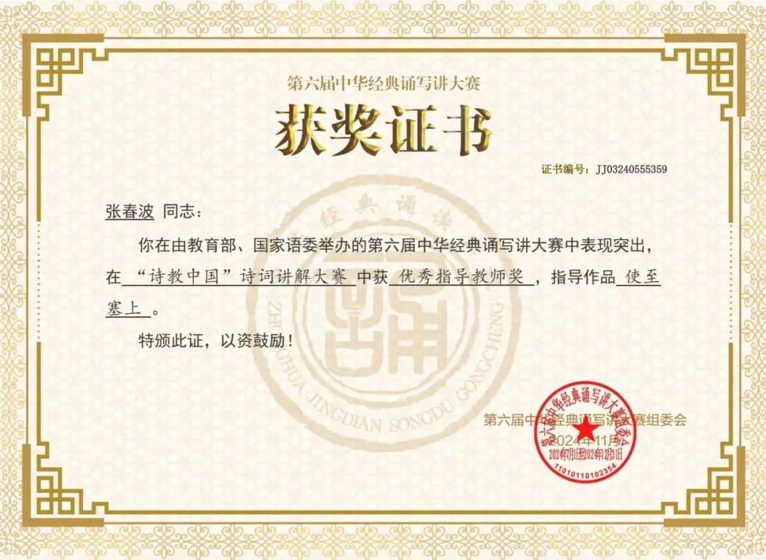 近日,第六届中华经典诵写讲大赛圆满落幕。我院学生侯艺萱在“诗教中国”诗词讲解大赛中获得大学生组一等奖,我院教师张春波在“诵读中国”诵读大赛中获得教师组二等奖,我院学生祁鹏辉、刘洪楷、谭昭喜、郑俊杰在“诵读中国”诵读大赛中获得大学生组三等奖,我院学生张佳楠在“诗教中国”诗词讲解大赛中获得大学生组优秀奖。