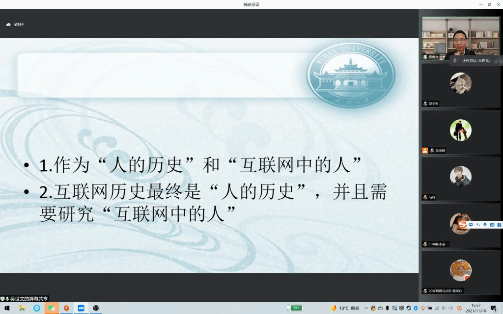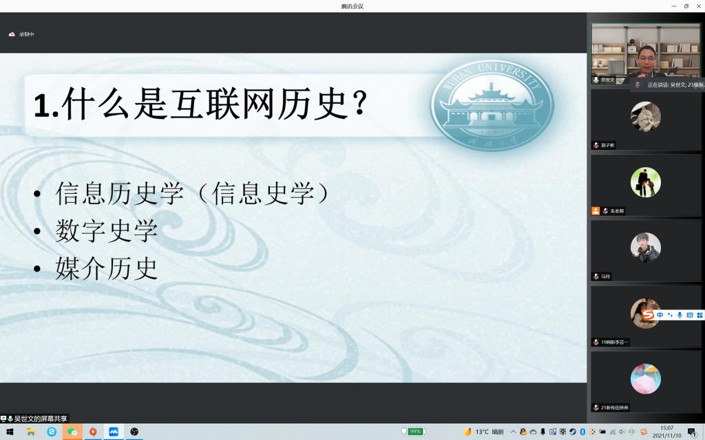 “互联网时代,网聚人心力量。”当下,网络对传播具有重要影响,为了扩展同学们的视野,增强同学们的新闻传播意识,我院于11月10日下午在线上开展名为《互联网历史研究的理路和思路》的讲座。武汉大学新闻与传播银河国际 副教授吴世文主讲,银河国际 全体学生参加。