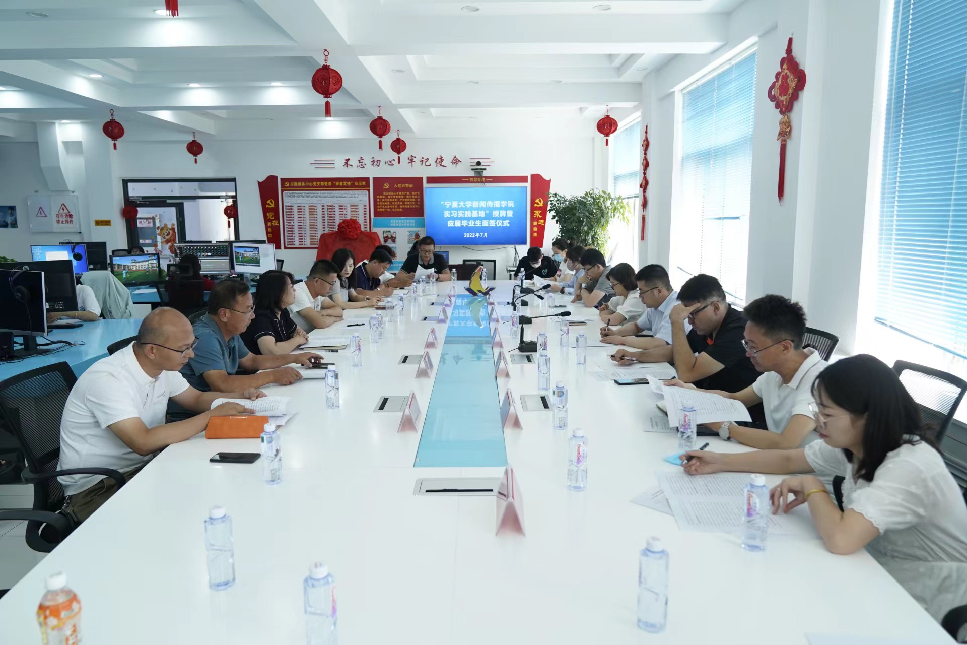 与会双方领导共同为实习实践基地揭牌,师生参观了灵武市融媒体中心,会后,部分2022届毕业研究生和本科生参加了灵武市融媒体中心的求职面试活动,签订了聘用意向书。