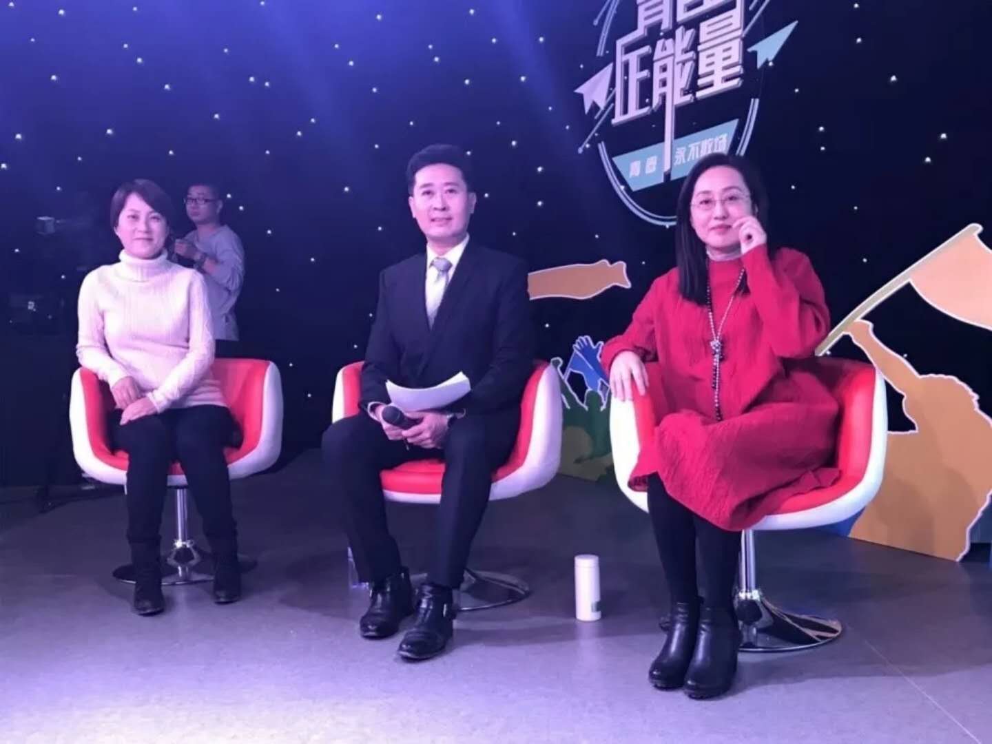 2014级和2015级学生一起到宁夏教育电视台参加《创未来》节目一周年总结报告会。在电视台演播室里,报告会主持人2014级赵义凡同宁夏电视台著名主持人张静涛、银河国际
